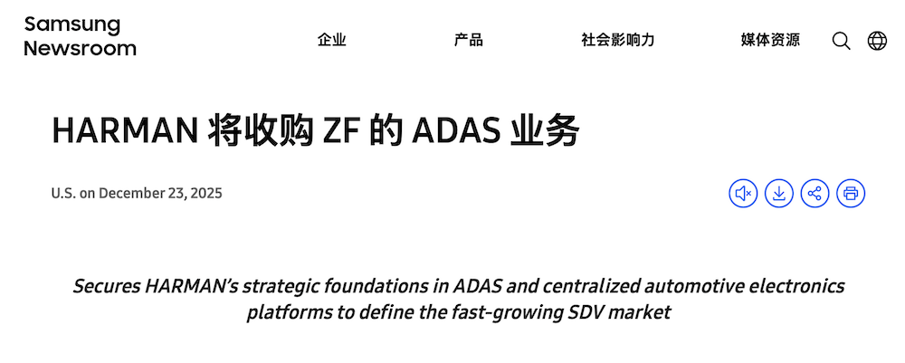 文章核心观点 - 三星电子通过其子公司哈曼国际以17.6亿美元收购采埃孚的ADAS部门,旨在快速提升其在汽车零部件市场的竞争力,整合数字座舱与ADAS,并计划到2030年将哈曼的年销售额提升至200亿美元 [1][5][8] - 采埃孚为应对沉重的财务压力、减少负债并聚焦核心业务(如底盘、动力总成),决定出售其ADAS部门,这是其战略重组的重要步骤 [5][11][14] - 此次交易反映了汽车行业竞争正从单一产品技术较量,升级为以软件定义汽车为核心的系统平台之争,行业整合与重组加剧 [16][18] 交易概述 - 三星子公司哈曼国际将以17.6亿美元(约合人民币123亿元)的价格收购采埃孚的高级辅助驾驶系统(ADAS)部门 [1] - 交易预计于2026年下半年完成交割,约3750名员工将随业务转入哈曼 [3] - 这是三星自2017年收购哈曼8年后,在汽车电子领域的又一次大规模收购 [3] 收购方:三星/哈曼的战略与布局 - 三星通过收购旨在深化自动驾驶布局,计划将哈曼的数字座舱与ADAS整合在中央控制器架构下,以提升满足汽车市场需求的能力 [8] - 三星在自动驾驶领域布局超9年,2016年收购哈曼,2017年获自动驾驶路测牌照,2018年推出模块化自动驾驶平台Drvline,但此前在ADAS硬件集成与量产经验上有所欠缺 [6][8] - 三星官方计划到2030年使哈曼的年销售额达到200亿美元(约合人民币1403亿元),较其2024年143亿美元(约合人民币1003亿元)的销售额实现大幅增长 [8][9] 出售方:采埃孚的交易背景与动机 - 采埃孚出售ADAS部门是其战略重组的重要里程碑,旨在显著减少财务负债,并将资源聚焦于底盘、动力总成等核心技术 [5][14] - 采埃孚面临沉重的财务压力:2014-2024年净负债从2.79亿欧元(约合人民币23亿元)爆炸式增长至105亿欧元(约合人民币869亿元),2024年净亏损10.2亿欧元(约合人民币84亿元),年均利息支出高达5.75亿欧元(约合人民币48亿元) [11][13] - 为降本,采埃孚此前已官宣大规模裁员计划,预计2028年底前在德国裁员1.1万-1.4万人,并引发员工示威,原CEO亦因此提前卸任 [13] - 交易后,采埃孚并未完全退出自动驾驶领域,将继续在商用车领域开展相关业务,并保留底盘和被动安全业务 [5] 交易标的与行业影响 - 采埃孚出售的ADAS部门业务包括汽车计算平台、摄像头、雷达和ADAS系统解决方案等 [5] - 此次交易凸显汽车行业竞争正升级为以软件定义汽车为核心的系统平台之争,产业链参与者通过兼并、重组、整合重新定位的趋势将越来越常见 [16][18]