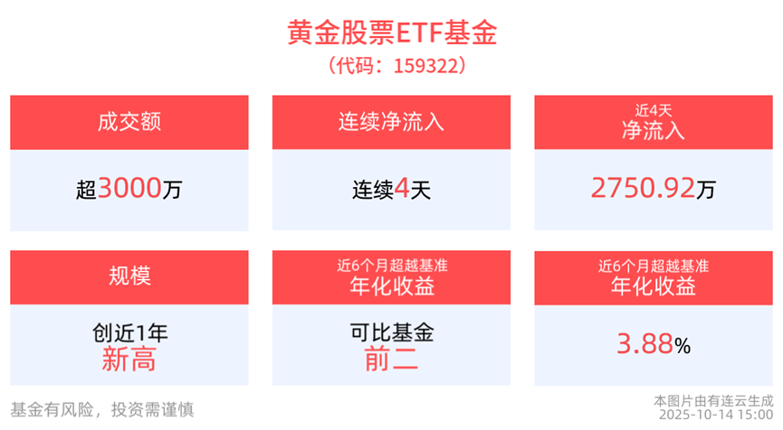 现货黄金上涨近0.9%,触及每盎司4179.92美元的历史新高。景顺亚太区全球市场策略师赵耀庭认为,黄金需求的一个主要 驱动因素,是各国央行积累黄金作为官方储备。事实上,黄金已超越欧元,成为全球央行第二大储备资产。各国央行购买 黄金是由于他们尚未看到美元之外的其他法定货币替代品。他认为,后续黄金涨势或将受到持续支撑。尽管黄金在2023年 和2024年均实现两位数回报,但投资者通过ETF的参与度仍然较低。相较之下,黄金在2025年迄今的强劲表现吸引投资者 重返市场,ETF资金流入转为正值。若此趋势持续,新增的投资参与可能成为推动黄金价格上行的一大驱动力。 流动性方面,黄金股票ETF基金盘中换手29.79%,成交3573.77万元,市场交投活跃。拉长时间看,截至10月14日,黄金股 票ETF基金近1周日均成交3046.44万元。 规模方面,黄金股票ETF基金最新规模达1.23亿元,创近1年新高。 从资金净流入方面来看,黄金股票ETF基金近4天获得连续资金净流入,最高单日获得876.66万元净流入,合计"吸 金"2750.92万元,日均净流入达687.73万元。 截至10月14日,黄金股票ETF基金近6月净值上涨4 ...
