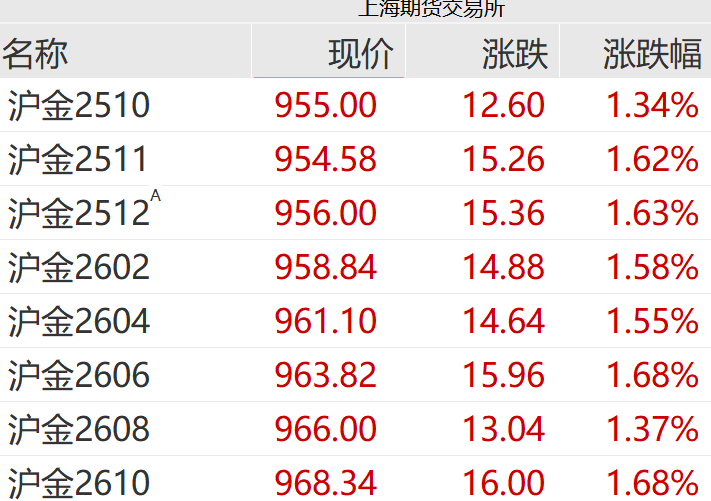 【导读】现货黄金再创历史新高,多家品牌金饰价格达1235元/克 黄金,继续飙涨! 10月15日上午,现货黄金价格继续走高,盘中触及4186.8美元/盎司的高位,涨超1%,再创历史新高。 COMEX黄金同步走高,盘中站上4200美元/盎司,涨超1%。 国内沪金主力合约集体走高,涨幅均超1%。 | | 上海期货交易所 | | | --- | --- | --- | | 名称 | 现价 | 淵鉄 涨跌幅 | | 沪金2510 | 955.00 | 12.60 1.34% | | 沪金2511 | 954.58 | 15.26 | | 沪令2512. | 956.00 | 15.36 | | 沪金2602 | 958.84 | 14.88 1.58% | | 沪金2604 | 961.10 | 14.64 | | 沪金2606 | 963.82 - - | 15.96 | | 沪金2608 | 966.00 | 13.04 1.37% | | 沪金2610 | 968.34 | 16.00 1.68% | 中国期货业协会数据显示,9月份,上海期货交易所的黄金期货成交量为865.79万手,环比增长78.49%,成交额为 ...