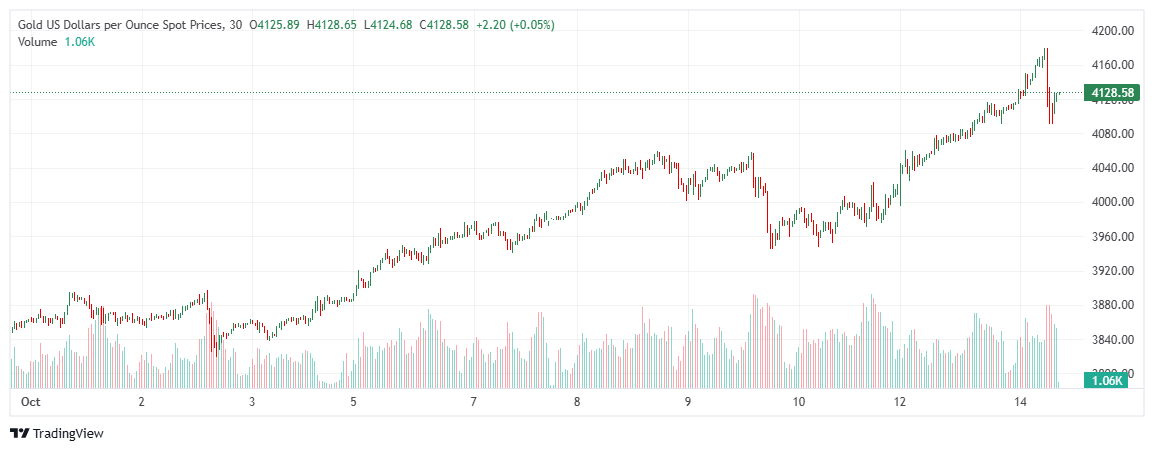 核心观点 - 金价在避险情绪和美联储降息预期推动下延续创纪录涨势,技术面和基本面均支持其进一步上涨 [1][4][5][6] 技术面分析 - 黄金价格过去三周沿上升趋势线支撑位运行,隔夜突破4,055-4,060美元阻力位及4,100美元关口,确认近期看涨前景 [3] - 日线相对强弱指数显示黄金处于极度超买状态,需谨慎操作 [3] - 任何有意义的回调可能被视为买入机会,4,060-4,055美元区域为关键缓冲带,若明显跌破可能引发技术性抛售,目标位看向4,000美元心理关口及3,985美元附近的趋势线支撑位 [3] 基本面驱动因素 - 地缘政治风险以及对美联储进一步降息的预期升温,利好无收益黄金 [4] - 交易员已完全消化美联储10月份降息25个基点的可能性,并预计12月再次降息的可能性高达90%,鸽派预期提振黄金 [6] - 美国政府停摆进入第三周,民主党和共和党持续僵局,引发经济不确定性 [5] - 中美贸易紧张局势再度升温,美国总统特朗普威胁自11月1日起对所有中国商品征收100%关税,随后虽软化立场,但贸易战升级风险仍支撑避险资产 [5] - 俄乌战争愈演愈烈,乌克兰无人机袭击克里米亚,俄罗斯军队攻击哈尔科夫,成为推高金价的另一地缘政治因素 [5]