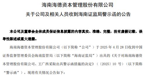 事件概述 - 2025年11月28日晚间,永泰能源、海伦哲及海德股份均公告,其实控人王广西因涉嫌信息披露违法违规被中国证监会立案调查[1] - 立案调查对象包括海德股份及其实控人王广西[1] 公司回应与影响 - 永泰能源公告称立案所涉主体为公司实控人,涉及事项与公司无关,不会对公司经营决策和正常生产经营活动产生影响,公司目前生产经营正常稳定且发展前景良好[2][3] - 海伦哲公告称王广西为公司第一大股东之控股股东的实控人,所涉事项与公司无关,不会对公司日常经营和业务活动产生影响,公司目前无控股股东及实控人,生产经营一切正常[3] 海德股份业务与财务表现 - 海德股份自2016年起由纺织、地产转型不良资产管理,成为A股少数以AMC为主业的平台之一[3] - 公司主要布局底层资产为能源、上市公司等业务领域,通过重组、重整、盘活等手段化解不良资产[3] - 2025年前三季度,海德股份营收同比下滑46.54%至4.57亿元,归母净利润同比下滑66.96%至1.71亿元[3] - 王广西作为海德股份董事长,2024年从公司获取的税前报酬总额为305万元[4] 历史监管问题 - 海南证监局于2025年4月底对海德股份和王广西采取出具警示函的监管措施[5] - 监管发现海德股份在债权投资及困境资产收购业务中存在被控股股东或其关联方占用资金的情况且未按规定披露,截至2024年12月31日被占用资金余额为8.84亿元,该款项已于2025年4月24日收回[7] - 上述行为被记入资本市场诚信档案数据库[7]