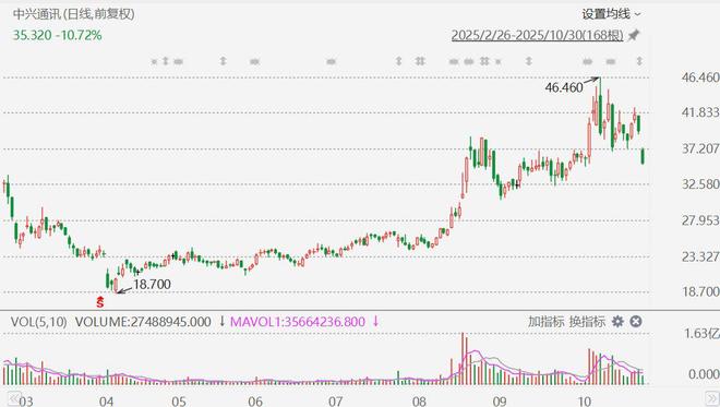 昨日中兴通讯A股因业绩不佳收跌超6%,港股昨日休市,中兴通讯港股今日补跌,盘初大跌近11%报 35.28港元。消息上,中兴通讯公布2025年三季报显示,1-9月实现营收1005.2亿元,同比增长11.6%,归 母净利润53.2亿元,同比下滑32.69%;单看第三季度,中兴通讯营收289.7亿元,同比增长5.11%;归母 净利润2.6亿元,同比下滑87.84%。 ...