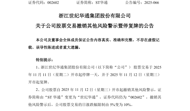 公司股票状态变更 - 公司关于撤销其他风险警示的申请已获得深圳证券交易所审核同意 [2] - 公司股票将于11月11日停牌1天 2025年11月12日开市起复牌并撤销其他风险警示 [4] - 股票简称将由"ST华通"变更恢复为"世纪华通" 证券代码仍为"002602" 撤销后日涨跌幅限制由5%变为10% [4] 风险警示历史与整改措施 - 去年11月 因2018年至2022年年度报告存在虚假记载 公司股票被实施其他风险警示 [2] - 为消除风险警示 公司针对监管部门处罚决定书中的认定事项逐一落实整改并完成差错更正 [4] - 大信会计师事务所对公司2018年度至2023年度前期会计差错更正及追溯调整事项出具了审核报告 [4] - 公司过去一年修订了企业治理、风险防控等6大类23项章程制度 持续开展制度优化、人事调整、业务聚焦等经营管理措施 [4] 2025年第三季度及前三季度财务表现 - 2025年第三季度营收实现同比"十连升" 首次单季度突破百亿大关至100.16亿元 [4] - 本报告期(2025年第三季度)营业收入为100.16亿元 比上年同期调整后的62.53亿元增长60.19% [5] - 今年1至9月 公司累计营业收入达272.23亿元 超越了去年全年的营收水平 [4] - 年初至报告期末净利润累计达43.57亿元 同比增长141.65% [4] - 年初至报告期末扣非后净利润为42.94亿元 同比增长140.98% [4] - 年初至报告期末公司经营性现金流达62.78亿元 同比增长81.33% [4] 其他关键财务指标与市场表现 - 本报告期归属于上市公司股东的净利润为17.01亿元 比上年同期调整后的6.45亿元增长163.78% [5] - 本报告期基本每股收益为0.24元/股 比上年同期调整后的0.09元/股增长166.67% [5] - 本报告期末总资产为432.27亿元 上年度末调整后为389.24亿元 [5] - 截至11月10日收盘 公司市值达1308亿元 比去年同期的380亿提升3倍以上 [6] - 今年前三季度 公司在A股游戏公司中营收、利润均排名第一 [5]