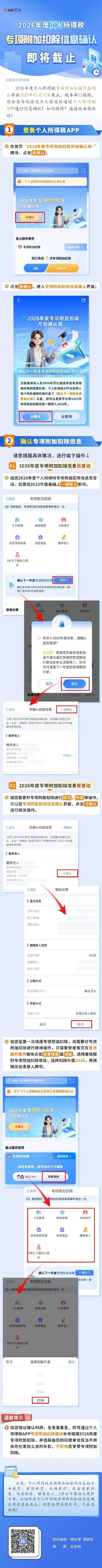 2026年度个人所得税专项附加扣除确认流程 - 2026年度个人所得税专项附加扣除信息确认时间为2025年12月1日至12月31日 [1] - 专项附加扣除项目共七项,包括住房租金、住房贷款利息、继续教育、赡养老人、3岁以下婴幼儿照护、子女教育、大病医疗 [1] - 税务部门提醒符合条件的居民个人需及时通过个人所得税App进行信息确认 [1] 信息确认操作方式 - 纳税人可通过个人所得税APP或自然人电子税务局网页端的“确认下一年度专项附加扣除”功能进行操作 [5] - 该功能支持将2025年已填报的专项附加扣除信息一键带入2026年继续使用 [5][7] 信息无变动的确认流程 - 若2026年度专项附加扣除信息无变动,纳税人仅需在2025年度信息基础上进行一键带入操作 [6][7] - 系统会将2025年度信息导入,纳税人确认无误后点击“一键确认”即可完成 [7][8] - 注意家庭成员身份信息验证不通过或已失效的扣除信息将无法被带入,需自行重新填报 [7] 信息有变动的操作流程 - 若需要对专项附加扣除信息进行修改或作废,可在确认界面点击“可确认”进入相关操作 [8] - 在填报详情页面,纳税人可对基本信息、被赡养人信息、分摊方式及申报方式等进行修改或删除 [8][9] 首次填报或新增扣除项操作 - 首次填报或需要新增专项附加扣除项目的纳税人,需在APP首页“重点服务推荐”模块点击“我要填报” [9] - 进入后选择需要填报的扣除项目,并选择扣除年度为2026年,再录入相关信息即可完成 [9] 错过确认时间的补救措施 - 若纳税人错过集中确认时间,仍可通过个人所得税APP专项附加扣除模块补充填报2026年度信息 [10] - 补充填报后,可选择由扣缴单位在当年剩余月份发放工资时进行补扣,不影响享受扣除优惠 [10]