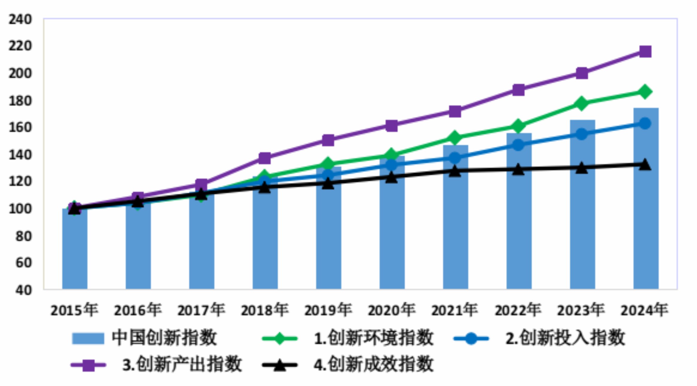 中国创新指数总体表现 - 2024年中国创新指数达到174.2,比2023年增长5.3% [2] - 指数四个分领域的18个评价指标指数中,每万名R&D人员高价值发明专利拥有量指数、理工类毕业生占适龄人口比重指数等2个指标指数增速连续3年超过10% [2] 创新环境持续改善 - 2024年创新环境指数为186.0,比上年增长4.9%,该领域5个评价指标指数全部实现增长 [3] - 理工类毕业生占适龄人口比重指数比上年增长10.8%,2024年我国理工农医类本科及以上毕业生人数达314.5万人,比上年增加17.2万人,占比达到50.7% [3] - 规模以上工业企业中加计扣除减免政策受惠企业达13.7万家,增加1.4万家,比上年增长11.1% [3] 创新投入继续增加 - 2024年创新投入指数为162.6,比上年增长5.1%,该领域4个评价指标指数全部实现增长 [4] - 基础研究经费达2500.9亿元,比上年增长10.7%,占R&D经费比重达到6.88% [4] - 企业对全社会R&D经费增长贡献率达到77.1%,规模以上工业企业R&D经费为22547.7亿元,比上年增长7.5% [4] - 规模以上工业企业中,有30.3万家企业开展了技术创新活动,占比为60.6% [4] 创新产出较快增长 - 2024年创新产出指数为215.8,比上年增长8.1%,是四个分领域中增长最快的领域 [5] - 发明专利授权数为104.5万件,比上年增长13.5%,截至2024年底境内有效发明专利达到468.2万件,比上年增长16.6% [5] - 高价值发明专利拥有量达到197.8万件,占境内有效发明专利的42.2%,每万人口高价值发明专利拥有量14件,比上年增加2.2件 [5] - 规模以上工业企业中共有9.2万家企业拥有注册商标,比上年增长13.7%,共拥有注册商标174.2万件,比上年增长16.6% [5] - 技术市场成交合同数99.4万项,成交总金额6.8万亿元,分别比上年增长5.1%和11.2% [5] 创新成效稳步提升 - 2024年创新成效指数为132.4,比上年增长1.9% [7] - 全员劳动生产率为173898元/人,比上年提高4.9% [7] - “三新”经济增加值为24.3万亿元,比上年增长6.7%,占GDP的比重为18.01% [7] - 规模以上工业企业实现新产品销售收入35.5万亿元,比上年增长3.9%,占营业收入比重为25.4% [7]
