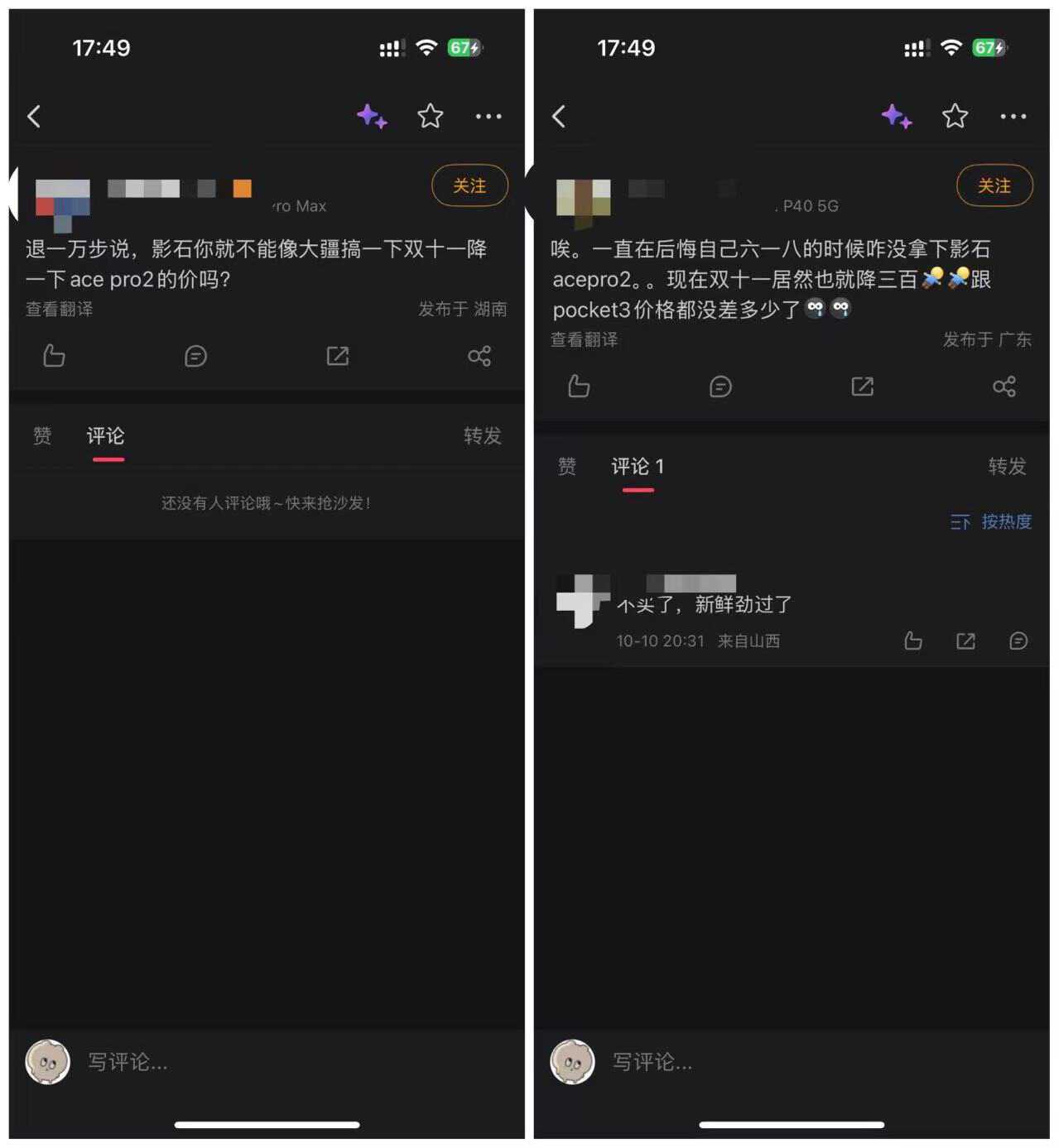 早在10月14日,影石创新创始人刘靖康就曾于微博侧面回应"可能有一部分因为我们影石的原因导致DJI大幅降价",并称将为在10.2到10.8之间购买大疆产品 的客户赠送影石100元无门槛代金券。 但在此之外,影石并未以同样的大力度促销"迎战"。「电厂」关注到,多位消费者与各类社交平台发布有关影石双十一促销力度不及大疆的相关消息。 11月4日下午,影石创新举办2025第三季度业绩说明会。 由于具体财报数据已于上周公布,说明会上公众关注的问题,集中于影石与大疆在全景相机、无人机产品的正面竞争。 从双十一预热阶段的10月份开始,大疆官宣展开限时促销,包含云台相机、运动相机、无人机等多款产品系列,有产品价格降幅逾千元。此举被视为其主动 吹响了价格战的号角。 在今天的说明会上,刘靖康再次回应了"价格战"的问题:我们认为,友商进入全景相机市场后发起的价格竞争为市场扩容创造了条件,同时,也出现了越来 越多的消费者因为差异化优势选择了影石,包括可更换镜头的硬件设计,全景云存储、AI自动剪辑软件等软件独家功能,这些都是我们在全景相机领域的 核心竞争力。 而针对大疆占据先发优势的无人机市场,影石称其与第三方合作的无人机品牌影翎An ...