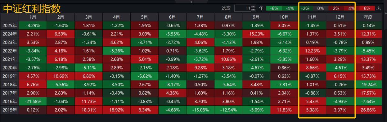 临近年末,市场趋向谨慎,红利资产热度再起,资金转而流向高股息资产。 上交所数据显示,12月4日中证红利ETF(515080)单日获3794万元资金净申购流入;此外锚定港股高股息资产的港股红利低波ETF(520550)亦大幅吸金 3004万元,值得关注的是,这已经是该ETF连续第11日获资金增仓,区间累计净申购额近1亿元。较为强劲的资金流入势头,显示目前港股、A股高股息资产 正逐步成为不少资金年末配置"之选"。 其背后主要逻辑,在于机构投资者为锁定当年收益,通常会转向防御,相对稳健的红利资产成了配置目标。此外,这一趋势背后也形成红利资产特有的年末 日历效应。 统计结果显示,中证红利ETF(520550)标的中证红利全收益指数的相对超额胜率在不同月份的表现呈现出一定的季节性特征,即所谓的"日历效应"。从历 史数据来看,2015年以来,中证红利全收益指数在11月、12月收红的概率分别为80%、50%。 | 中证红利指数 | | | | | | | | 选取 | 11 年 | -6% -4% | -2% 0% | 2% | | --- | --- | --- | --- | --- | --- | --- | --- ...