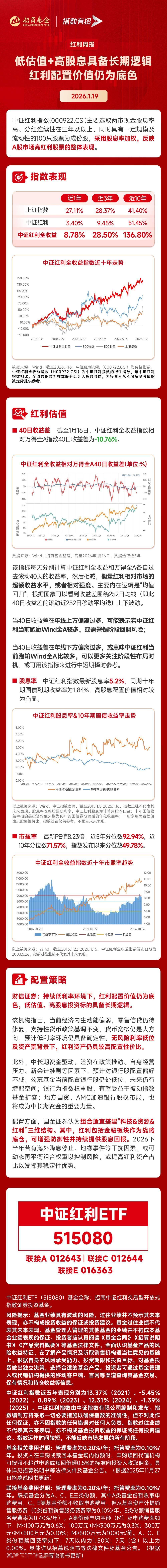 市场表现与宏观背景 - 1月20日成长板块回调,三大指数走低,但高股息方向逆势坚挺,煤炭板块异动拉升,中证红利ETF盘中上涨0.32%,最新规模达83.84亿元 [1] - 当前经济内生动能偏弱,零售信贷仍待修复,支持性货币政策基调不变,预计低利率环境具备确定性 [1][18] - 无风险利率低位及资产荒背景下,红利资产具备较高配置性价比,低估值、高股息投资标的具备长期逻辑 [1][18] 中证红利指数核心数据 - 中证红利指数现金分红总额自2018年以来已连续6年增长,2024年分红家数达100家,分红金额达9220亿元,均创历史新高 [2] - 2025年,中证红利指数中报及季报合计分红公司数量已达51家,现金分红总额约4097亿元 [2] - 截至1月16日,中证红利指数最新股息率为5.2%,同期十年期国债到期收益率为1.84%,高股息配置价值凸显 [2][11] - 中证红利指数最新市盈率为8.23倍,其近5年、近10年及指数发布以来的市盈率分位数分别为92.94%、71.57%和49.78% [14] 指数历史表现 - 近1年、近3年、近10年,中证红利价格指数收益率分别为3.40%、9.45%、51.45% [4] - 近1年、近3年、近10年,中证红利全收益指数收益率分别为8.78%、28.50%、136.80% [4] - 截至1月16日,中证红利全收益指数相对万得全A指数的40日收益差为-10.76%,意味着中证红利当前跑输Wind全A较多 [2][8] 机构配置观点 - 财信证券指出,在持续低利率环境下,红利配置价值仍为底色 [18] - 国金证券建议搭建“科技&资源&红利”三维投资结构,其中红利部分包括金融板块作为战略底仓,以增强防御性并提供持续股息回报 [1][18] - 机构认为,2026下半年若出现海外降息停止、地缘事件等干扰因素,可动态再平衡组合权重以控制风险,或提高红利资产占比以发挥其稳定性优势 [1][19] - 中长期资金如险资、公募基金、地方国资及AMC预计将持续成为银行股等红利资产的重要配置力量 [18] 中证红利ETF产品特征 - 中证红利ETF跟踪中证红利指数,自上市以来已连续15次分红,每十份累计分红金额为3.65元 [1] - 该ETF自2024年以来延续季度评估分红的节奏,每年分红4次,2024-2025年已累计分红8次 [1]