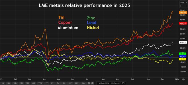 2025年LME基本金属市场格局核心主题 - 供应中断与贸易关税引发的市场重构是定义今年LME基本金属市场格局的核心主题[1] - 尽管需求面难言乐观,但供应链承压推动LME指数攀升至2022年俄乌冲突爆发以来的最高水平[1] - 美国前政府的关税政策是引发今年市场动荡的另一重因素,其引发的市场扰动与实际影响不相上下[1][3] 铜市场表现与结构 - LME三个月期铜价格持续刷新历史高点,向每吨12,000美元关口发起冲击[3] - 芝加哥商品交易所(CME)的美国铜期货合约价格走势更为强劲,其定价已计入精炼铜进口可能加征关税的预期[3] - 美国针对铝产品的定向关税及拟对铜产品加征关税的潜在威胁,正引发全球金属贸易格局的结构性剧变[1] 锡市场成为新焦点 - 锡是今年金属市场的“明星品种”,正面临多重供应威胁[5] - 全球锡矿供应高度集中于刚果(金)、缅甸佤邦等少数高风险产区[5] - 作为LME核心期货合约中规模最小的品种,锡期货的资金参与度显著提升,加剧了价格波动[7] - 锡以电路板焊料的形式,在物联网时代拥有广阔前景,正日益进入投资者的视野[7] 铝市场供应趋紧 - 铝是今年LME表现第三强劲的金属品种[7] - 市场逐渐意识到全球最大铝生产国中国的产能已触及政府设定的产能上限[7] - 花旗银行称铝正“毫无察觉地滑向20年来最严重的供应短缺”[8] - 受对俄铝制裁及美国进口关税翻倍影响,全球铝贸易流出现紊乱[9] - 当前美国铝现货较LME基准价的溢价达到每磅89美分(折合每吨1,967美元),创下历史新高,表明美国市场正陷入供应短缺[9] 锌市场遭遇逼仓与库存流动 - LME锌市场在10月遭遇剧烈逼仓行情[10] - 随着LME锌库存降至仅5万吨的低位,锌现货对三个月期锌的溢价一度突破每吨300美元,升水幅度创历史纪录[10] - 今年1-10月,全球锌矿产量同比强劲增长6.5%,精炼锌产量同比增长2.9%[14] - 欧美地区的精炼锌产量同比下降2.2%,受部分冶炼厂关停等因素影响[14] - 中国的过剩锌库存正开始流向欧美市场,以缓解当地的供应短缺[14] 铅市场供应过剩与库存流转 - 铅市场目前供应充足,且短期内预计不会改变[14] - 交易者倾向于通过仓单流转赚取仓储补贴收益,而非现货销售[16] - 今年全年,超过100万吨铅在LME认可仓库间进出流转,但注册库存仅净增16,425吨[16] - LME铅注册库存与场外库存的总量持续攀升,从2023年初的21,500吨增至如今的44万余吨[16] 镍市场面临供应过剩压力 - 受印尼镍产量持续激增影响,全球镍供应增速远超需求增速,LME镍库存大幅攀升[16] - 据麦格理银行分析,中国存在“大规模未公开的战略性镍库存囤积”,否则LME镍库存规模将进一步膨胀[17] - LME近期批准印尼永恒工业公司一款年产能达5万吨的新镍产品注册[17] - 市场寄望印尼能在2026年控制镍产量增速,这说明了当下镍市场的核心矛盾[17]