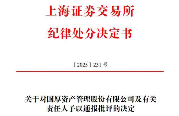 上交所决定,对国厚资产及时任董事长、总经理、财务负责人兼信息披露事务负责人李厚文予以通报批 评。处分决定书显示,国厚资产及相关责任人在规定期限内对纪律处分事项未提出异议。上交所决定将 此次通报批评抄送中国证监会,并记入诚信档案。 公开信息显示,国厚资产一家具有金融不良资产批量收购处置业务资质的地方资产管理公司,公司成立 于2014年4月,注册资本为人民币27.92亿元。 就在上个月,因公司债券违约,国厚资管子公司遭资产冻结。据其11月4日公告,国厚资管子公司芜湖 昱顶企业管理中心(有限合伙)持有的上海浦创企业管理咨询有限公司股权被冻结,冻结标的金额为 1.01亿元,涉及债权金额本金11.23亿元及相关利息。冻结原因系未按时兑付"H22国厚1"债券回售本 金、利息及补偿金。 来源:上交所网站 上交所指出,国厚资产于2022年5月发行了公司债券22国厚01,并在上海证券交易所挂牌转让。经查 明,国厚资产2024年7月至12月期间存在债务逾期情形,其中达到临时信息披露标准的逾期金额合计 24.56亿元,占发行人合并报表范围上年末净资产的59.28%,但发行人未及时就相关事项披露临时报 告。 上交所认定,国厚资产的行 ...