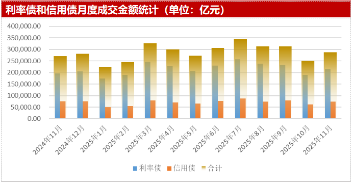 债券二级市场11月成交概况 - 11月债券二级市场总成交金额为340,656.40亿元,实现同比2.21%和环比14.62%的双增长 [3] - 利率债成交金额为214,422.16亿元,同比、环比分别增长9.81%和13.72% [4] - 信用债成交金额为73,338.98亿元,同比减少3.40%,但环比增加19.23% [4] 信用债成交结构特征 - 产业债成交金额环比增加16.81%,城投债成交金额环比增加12.74%,市场流动性较前期改善 [4] - 高等级债券是市场成交主力,低评级债券交投热度无明显波动,反映市场信用风险偏好稳健 [1][4] - 产业债成交偏好1年以下短久期品种,城投债成交久期则向3-5年中长期限倾斜 [1][4] 信用利差表现 - 11月信用利差呈V型震荡,月末收于37.34bp,与上月末基本持平,但较去年同期收窄22.14bp [1][4] - 截至11月30日,行业利差中位数最高的五个行业为:医药生物(93.90bp)、房地产(86.90bp)、电力设备(86.15bp)、钢铁(85.46bp)、社会服务(75.03bp) [5] - 行业利差中位数最低的五个行业为:传媒(37.48bp)、公用事业(44.12bp)、交通运输(45.24bp)、电子(46.50bp)、建筑材料(48.49bp) [5] 行业与区域信用分化 - 多数行业利差中枢环比走阔,钢铁、石油石化等周期性行业利差上行超20bp [5] - 医药生物行业利差继上月走阔10bp后,本月再度大幅走阔20bp,行业信用风险定价持续走高 [5] - 城投债整体信用利差延续收窄态势,但区域分化明显:吉林城投债利差环比涨幅接近30bp,河北、湖南、陕西区域利差增幅也超过10bp [5] 后市展望 - 信用利差整体将维持低位震荡格局,进一步压缩或大幅走阔的空间均相对有限 [1][6] - 利差难以大幅压缩因当前已处历史相对低位,下行动力不足 [6] - 利差难以大幅走阔因化债政策持续发力提供支撑,且市场高息资产稀缺格局短期难改,需求对利差形成支撑 [6]