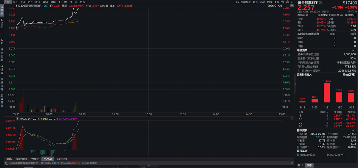 现货黄金突破5000美元大关!黄金股票ETF(517400)大涨超5.6%,连续5日资金净流入超2亿元
