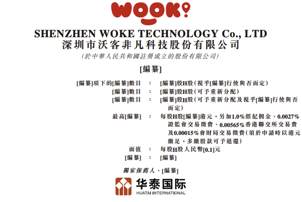 公司上市申请 - 深圳市沃客非凡科技股份有限公司于1月20日向港交所提交上市申请书 [1] - 本次发行的独家保荐人为华泰国际 [1] 发行股份详情 - 将发行H股,具体数目待定 [2] - 发行涉及可予重新分配的股份 [2] - 最高发行价待定,但费用结构明确:需另加1.0%经纪佣金、0.0027%证监会交易征费、0.00565%香港联交所交易费及0.00015%财务汇报局交易征费 [2] - 申请时须以港元缴足股款,多缴款项可退还 [2] - 每股面值为人民币0.1元 [2]