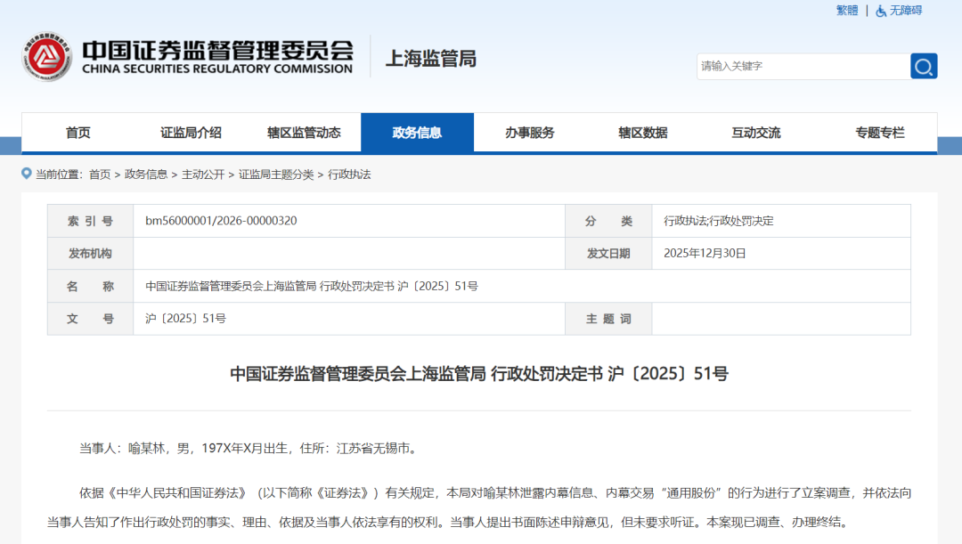内幕信息与交易详情 - 内幕信息为红豆集团拟转让其持有的通用股份控股权事项 相关信息不晚于2024年10月16日形成 并于2025年1月23日公开 [1][2] - 红豆集团最终于2025年4月与江苏省属国企苏豪控股签署协议 以21.18亿元转让通用股份24.50%的股份 导致通用股份实际控制人变更为江苏省国资委 [1][2] - 转让过程一波三折 红豆集团最初曾与广州工控达成转让意向 但后续终止了合作 [1][2] 涉案人员与行为 - 涉案人员喻某林为红豆集团原副总裁 作为法定内幕信息知情人 不晚于2024年10月20日知悉该内幕信息 [1][2] - 在敏感期内 喻某林实施了双重违法行为 一是向配偶弟弟王某军泄露内幕信息 二是利用其侄女王某然的证券账户进行内幕交易 [1][3] - 喻某林使用本人工作设备及资金 于2024年10月31日至12月24日期间买入通用股份37.24万股 并从中获利2.84万元 [1][3] 监管处罚结果 - 上海监管局依据《证券法》对喻某林作出行政处罚 罚没款合计112.84万元 [1][3] - 具体处罚包括 对其泄露内幕信息行为处以50万元罚款 对其内幕交易行为没收违法所得2.84万元并处以60万元罚款 [1][3] - 罚没款项需在处罚决定下达后15日内缴清 [1][3]
