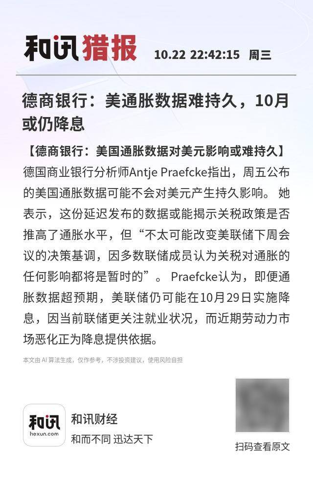 【德商银行:美国通胀数据对美元影响或难持久】德国商业银行分析师Antje Praefcke指出,周五公布的 美国通胀数据可能不会对美元产生持久影响。 她表示,这份延迟发布的数据或能揭示关税政策是否推 高了通胀水平,但"不太可能改变美联储下周会议的决策基调,因多数联储成员认为关税对通胀的任何 影响都将是暂时的"。 Praefcke认为,即便通胀数据超预期,美联储仍可能在10月29日实施降息,因当 前联储更关注就业状况,而近期劳动力市场恶化正为降息提供依据。 扫码查看原文 德商银行:美通胀数据难持久,10月 或仍降息 【德商银行:美国通胀数据对美元影响或难持久】 德国商业银行分析师Antje Praefcke指出,周五公布 的美国通胀数据可能不会对美元产生持久影响。她 表示,这份延迟发布的数据或能揭示关税政策是否 推高了通胀水平,但"不太可能改变美联储下周会 议的决策基调,因多数联储成员认为关税对通胀的 任何影响都将是暂时的"。Praefcke认为,即便通 胀数据超预期,美联储仍可能在10月29日实施降 息,因当前联储更关注就业状况,而近期劳动力市 场恶化正为降息提供依据。 本文由 Al 算法生成,仅作参考,不涉 ...