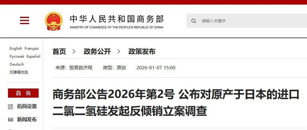 如果您希望可以时常见面,欢迎标星收藏哦~ 一、立案调查及调查期 自本公告发布之日起,商务部对原产于日本的进口二氯二氢硅进行反倾销立案调查,本次调查确定 的倾销调查期为2024年7月1日至2025年6月30日,产业损害调查期为2022年1月1日至2025年6月 30日。 二、被调查产品及调查范围 商务部公告 2026年第2号 公布对原产于日本的进口二氯二氢硅发起反倾销立案调查 中华人民共和国商务部(以下简称商务部)于2025年12月8日收到唐山三孚电子材料有限公司(以 下称申请人)代表中国二氯二氢硅产业正式提交的反倾销调查申请,申请人请求对原产于日本的进 口二氯二氢硅进行反倾销调查。商务部依据《中华人民共和国反倾销条例》有关规定,对申请人的 资格、申请调查产品有关情况、中国同类产品有关情况、申请调查产品对中国产业的影响、申请调 查国家有关情况等进行了审查。 根据申请人提供的证据和商务部的初步审查,申请人二氯二氢硅产量符合《中华人民共和国反倾销 条例》第十一条和第十三条有关国内产业提起反倾销调查申请的规定。同时,申请书中包含了《中 华人民共和国反倾销条例》第十四条、第十五条规定的反倾销调查立案所要求的内容及有关证 ...
