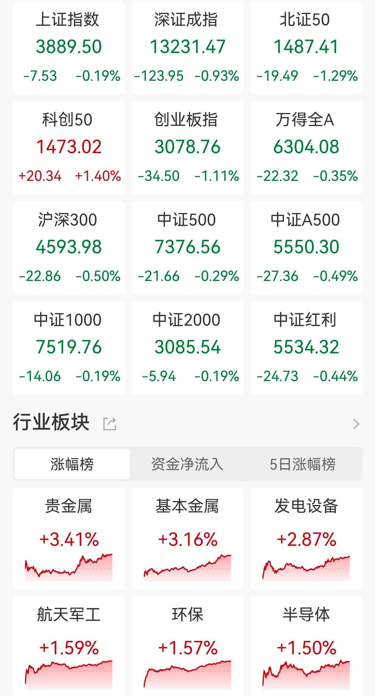 市场整体表现 - 中美经贸博弈背景下A股主要指数早盘集体大跌但尾盘回升 沪指最终跌0.19%报3889点 深证成指跌0.93% 创业板指跌1.11% [1] - 科创50指数逆市上涨1.4% 全市场成交额2.37万亿元 较前一交易日缩量1599亿元 [1] - 超3600只个股下跌 北证50指数下跌1.29% 万得全A指数下跌0.35% [1][2] 行业板块表现 - 贵金属板块领涨 涨幅达3.41% 基本金属板块上涨3.16% 发电设备板块上涨2.87% [2] - 航天军工板块上涨1.59% 环保板块上涨1.57% [2] - 稀土板块爆发 银河磁体 新莱福等多股涨停 源于商务部对稀土相关物项实施出口管制 [3] - 国际金价创新高推动黄金板块活跃 西部黄金 招金黄金涨停 [3] - 光刻机概念股走高 新莱应材涨停 可控核聚变板块走强 合锻智能等多股涨停 [3] - 机器人及减速器板块走低 斯菱股份领跌 汽车零部件板块下挫 宁波华翔跌超8% [3] - 消费电子板块普跌 协创数据跌超6% 混合现实 CRO 小米汽车及减肥药等板块跌幅居前 [3]
