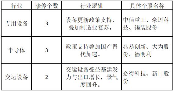 市场整体表现 - 上证指数上涨1.18%,深证成指上涨1.51% [1] - 个股涨跌幅中位数为上涨0.44%,表现弱于主要指数 [1] - 沪深两市不含ST个股涨停50家,较昨日减少7家;跌停5家,较昨日减少2家 [3] 行业与概念板块特征 - 涨停个股中,专用设备、半导体、交运设备行业数量最多,各有3家、3家和2家 [4] - 专用设备行业受设备更新政策支持及制造业复苏推动,代表个股为中信重工、蒙迈科技、锡装股份 [4] - 半导体行业受政策支持及国产替代加速推动,代表个股为兆易创新、大为股份、德明利 [4] - 交运设备行业受益于基建发力与出口增长,代表个股为必得科技、新日股份 [4] - 概念板块中,福建自贸/海西概念、核聚变、国产芯片概念涨停个股最多,各有5家 [5] - 福建自贸/海西概念受政策利好及区域经济活力释放推动,代表个股为厦门钨业、平潭发展等 [5] - 核聚变概念受能源革命预期及政策支持加速产业化进程推动,代表个股为东方银业、安泰科技等 [5] - 核聚变概念受关注,因相关团队致力于在2045年前后建成首个50赫兹百万千瓦级激光聚变电站 [2] 个股强势表现 - 涨停板个股中,有6只股价创出历史新高,包括兆易创新、东方钽业、纽威股份等 [8] - 涨停板个股中,有18只股价创出近一年新高,包括时空科技、厦门钨业、中电港等 [8] - 从连板情况看,首板个股38只,2连板个股6只,3连板及以上个股6只 [9] - 连板数前5的个股为盈新发展(6连板)、世龙实业(5连板)、时空科技(3连板)、平潭发展(3连板)、达华智能(3连板) [11] 资金流向 - 主力资金净流入金额前5的个股为恒宝股份、厦门钨业、兆易创新、安泰科技、景旺电子 [10] - 封板资金前5的个股为盈新发展(5.43亿元)、兆易创新(4.9亿元)、时空科技(4.61亿元)、大为股份(4.01亿元)、平潭发展(2.77亿元) [9][10]
