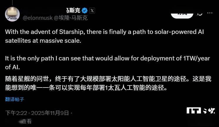 马斯克:星舰为大规模部署太阳能 AI 卫星开辟路径