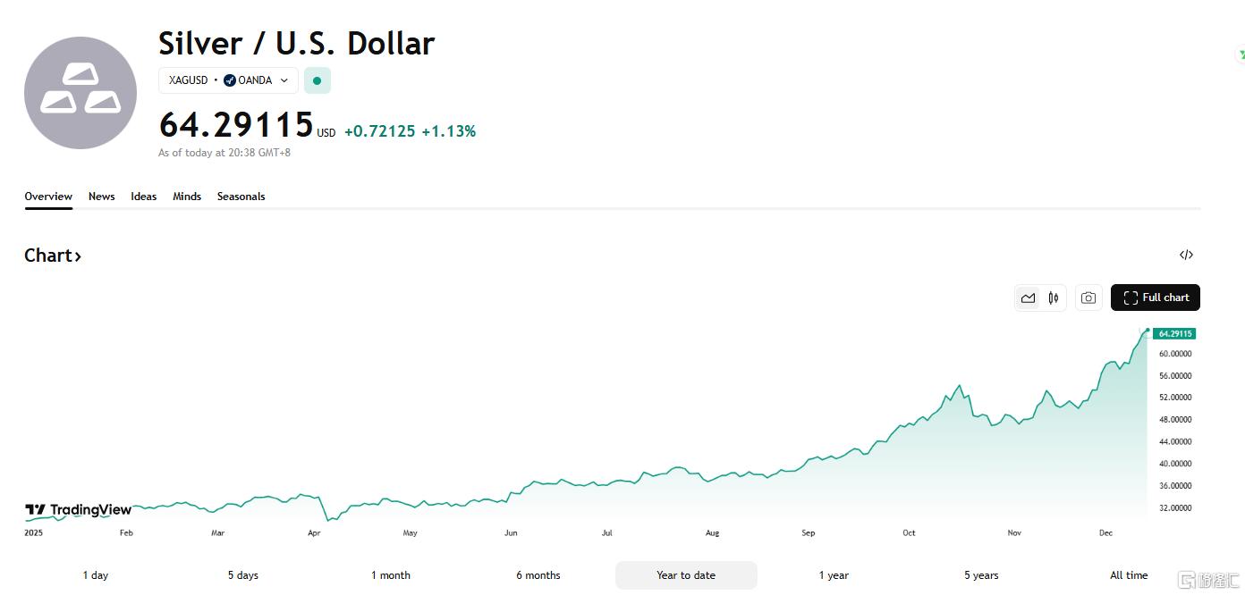 贵金属价格表现 - 现货黄金价格突破4330美元/盎司,涨幅1.17%,飙升至七周高位 [1] - 现货白银价格刷新历史新高至64.56美元/盎司,涨幅1.58% [1] - 黄金年内涨幅超65%,全年创下逾50次历史新高 [1] - 白银年内涨幅高达120%,成为全球资产中最大“黑马” [1] 价格驱动因素:避险与降息预期 - 俄乌和平计划博弈及特朗普加剧的美委地缘局势紧张,推升了避险需求 [9] - 美联储已开启今年第三次降息,如期降息25基点 [10] - 市场预计美联储未来将进一步宽松货币政策,交易员押注2026年有两次降息,尽管点阵图暗示仅一次 [10] - 美联储将于周五开始每月购买400亿美元的国债,进一步推升黄金吸引力 [11] 价格驱动因素:美元走弱 - 美元指数徘徊在两个月低点附近,并有望连续第三周下跌 [5] - 美元指数年内累计跌超近10% [5] - 美国以外国家的利率预期转向鹰派,凸显美联储相对鸽派立场,拖累美元 [12] - 多家华尔街大行预警,美联储降息可能使美元在明年重启跌势 [15] - 德意志银行预测美元将在明年对主要货币普遍走弱,可能意味着2020年以来的美元牛市周期走到尽头 [16] 行业需求动态:央行购金 - 全球官方黄金储备在10月净增53吨,环比增长36%,为年初以来最大月度净购金需求 [12] - 年初至今,全球央行报告的净购金量为254吨,维持稳固正增长 [12] - 中国黄金储备连续第十三个月增加,11月末较10月末增加3万盎司,总量升至7412万盎司 [12] - 95%的受访央行预计未来一年全球央行的黄金储备将会增加 [12] 行业供需与资金流向 - 全球黄金ETF在11月底的总持仓量升至3932吨,连续第六个月增长 [14] - 世界白银协会预测,2025年全球白银市场将出现约9500万盎司的结构性供应缺口,为连续第5年供不应求 [15] - 分析师指出,稳健的央行需求、重新出现的ETF资金流入、宽松政策及持续的地缘政治紧张局势,将为黄金提供支撑,涨势有望延续至2026年 [15]