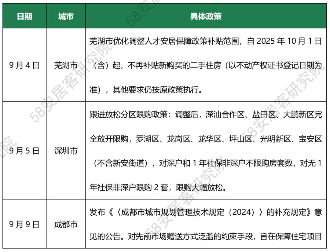 新房市场整体概况 - 9月份60城新房在售项目量环比上涨1.7%,呈现"三四线领涨、一、二线分化"格局,低能级城市供应加速释放,高能级城市去化有效提速 [1] - 9月重点60城新房线上找房热度指数为54.1,同比下降12.9%,降幅较8月的-11.5%小幅扩大,环比8月的57.4下降3.3 [1] - 9月各梯队城市找房热度指数呈现分化态势,新一线城市最高为59.6,其次为一线的58.8、二线的53.6,三四线城市最低为48.6 [1] 新房市场价格表现 - 9月重点60城新房线上找房均价为19653元/㎡,环比微涨1.4% [2] - 60城中有41个城市新房找房均价上涨,2个城市平稳不变,17个城市新房均价下跌 [2] - 分梯队城市找房均价环比涨幅分别为二线城市2.0%、新一线城市1.4%、三四线城市1.0%、一线城市0.3% [28] 中央层面房地产政策 - 9月房地产政策呈现多部门协同、聚焦精准调控与长效发展的特点 [3] - 9月11日自然资源部探索土地管理制度改革、创新产业用地供应、盘活存量土地等,国务院批复10个地区开展要素市场化配置综合改革试点 [4] - 9月12日住建部强调央企要助力城市发展,推动构建房地产发展新模式 [5] - 9月23日央行货币政策委员会会议提出加大存量商品房和土地盘活力度,巩固房地产市场稳定态势 [6] - 政策整体呈现"稳预期、保底线、促转型"的梯度化布局特征 [7] 地方层面房地产政策 - 地方政策呈现多维度、精准化特点,包括限购放松、补贴政策、公积金优化等 [8][9] - 深圳调整分区限购,深汕合作区等多区域完全放开,部分区域对深户和社保满1年非深户不限购房套数 [9] - 芜湖、广西、延吉、广元、重庆等多地推出购房补贴,形式含按面积补贴、固定金额补贴,并针对人才、多孩家庭、团购群体细分 [9] - 河南提高住房公积金个人贷款额度上浮10%,广州扩大公积金提取用于购房首付的房源范围 [9] - 成都通过政策调整约束市场赠送乱象,保障住宅项目品质 [9] - 河南八部门联合出台12方面措施促进市场平稳健康发展 [10] 新房供应与库存走势 - 9月60城新房在售项目量环比上涨1.7%,逆转之前连续下降趋势 [14] - 分城市梯队看,一线城市在售项目量环比下降1.1%,新一线城市环比提升2.2%,二线城市提升1.7%,三四线城市环比上涨2.5% [14] - 9月新房待售项目数量环比增加18.8%,逆转8月环比下降0.6%的趋势,主要因"金九"月份供应量大幅增加 [17] 各梯队城市市场表现 - 一线城市找房热度为58.8,较8月下降2.5点,北京、上海、深圳放开部分区域限购后对成交量有提振,但购房者逐渐回归理性 [21] - 新一线城市找房热度为59.6,较8月下降2.0点,需求韧性较强但项目去化压力导致热度回落 [21] - 二线城市找房热度为53.6,较8月下降3.2点,部分城市如珠海、常州、南通库存压力大,消费观望情绪浓厚 [21] - 三四线城市找房热度为48.6,较8月下降3.7点,经济基础弱、人口外流严重的城市市场活跃度进一步下降 [21] 新房面积段需求结构 - 90-120平方米户型是市场主流需求,占比达29.0%,环比8月减少0.4% [23] - 120-140平方米户型占比20.9%,环比增加0.1%,140-180平方米户型占比19.9%,环比下降0.1% [23] - 70平方米以下户型占比6.8%,70-90平方米户型占比9.5%,合计16.3%,刚性需求相对稳定 [23] - 180平方米以上大户型占比13.6%,需求相对小众 [23] 重点城市价格变动详情 - 一线城市中深圳受放开限购影响环比上涨1.3%,北京和上海分别上涨0.7%、0.1%,广州环比下降1.1% [28] - 新一线城市中杭州涨幅最大为6.2%,天津、武汉、南京涨幅分别为4.7%、4.6%、4.1% [28] - 二线城市中温州涨幅领先达6.9%,石家庄、厦门分别上涨6.7%、6.4%,惠州降幅最大为3.7% [28] - 三四线城市中海口涨幅最大为5.5%,三亚上涨2.5%,威海降幅最大为2.7% [29]