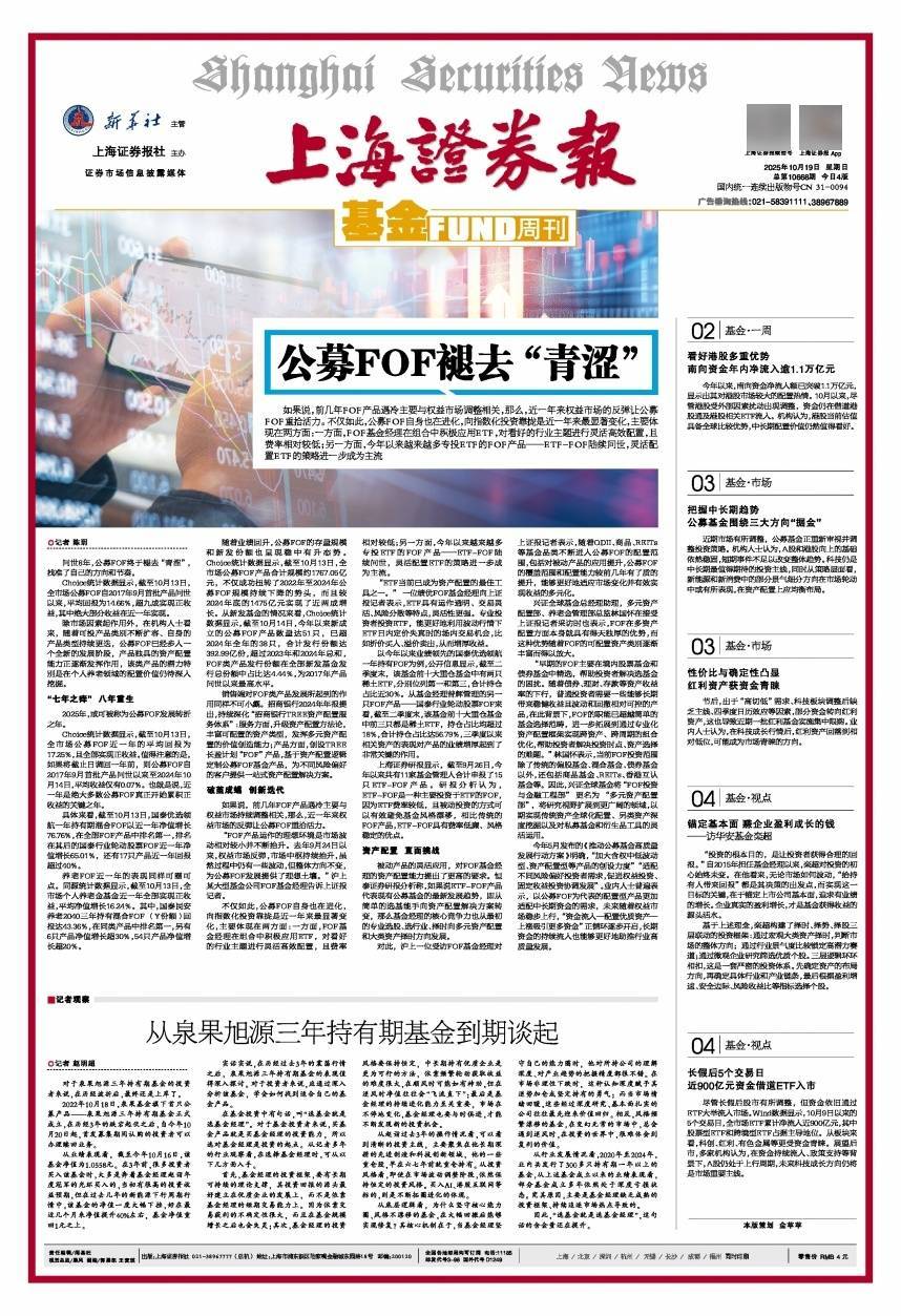对于泉果旭源三年持有期基金的投资者来说,在历经波折后,最终还是上岸了。 证券市场信息披露 Male 201-02-20 14 2025年10月19日 星期 国内统 连续出版物号CN 31-00 广告看频热线:021-58391111,38967889 如果说,前几年FOF产品遇冷主要与权益市场调整相关,那么,近一年来权益市场的反弹让公募 FOF 重拾活力。不仅如此,公募FOF自身也在进化,向指数化投资攀拢是近一年来最显著变化,主要体 现在两方面:一方面,FOF基金经理在组合中系极应用ETF,对看好的行业主题进行灵活高效配置,且 费奉相对较低;另 方面,今年以来越来越多专投ETF的FOF产品 ETF-FOF陆续同世,灵活配 ■ETF的策略进一步成为主流 Q 记者 陈剧 各做紧":服务方面,升级资产配置方法论 学高可配管的资产类型,发挥多元资产 體的价值创造力;产品力量, 制设TRER 长盈计划 "FOF" 产品,基于资产配置设备 定制公募FOF基金产品,为不同风险偏好 的客户提供一起式能产品量解决方案。 破葡难编 创新伙代 制世8年,公爵FOF终于根去"膏盗"。 视墙了自己的方向和书泰 线、其中绝大部分散战车厅 ...