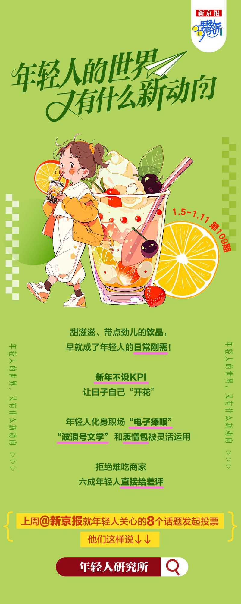 饮品消费习惯 - 甜味及含咖啡因/功能性饮品已成为年轻人的日常必需品 [1][4][7] - 33.8%的年轻人对这类“续命水”有深度依赖,一天不喝就难受 [8] - 25.8%的年轻人偶尔消费,主要受嘴馋驱动 [8] - 仅2.0%的年轻人表示已戒除,转向只喝白开水 [9] 社交偏好与“社恐” - 42.3%的年轻人认为线上聊天能提供缓冲,线下社交则容易尴尬 [10] - 36.6%的年轻人偏好独处,认为线下社交太耗费精力 [10] - 14.1%的年轻人因社交圈子固定,与不熟的人缺乏共同语言 [10] - 7.0%的年轻人因社交媒体上的“完美人设”而感到压力,害怕自己没话题 [10] 生活与职业规划态度 - 超过半数(51.1%)的年轻人对新年不做专门规划,倾向顺其自然 [11] - 34.1%的年轻人仅设定大致方向,并根据情况灵活调整 [11] - 仅9.1%的年轻人会制定详细规划,列出具体目标和步骤 [11] 支付方式 - 56.6%的年轻人已完全拥抱数字支付,不再使用实体钱包 [18][19] - 18.6%的年轻人使用精简版钱包,只装卡和证件 [19] - 16.6%的年轻人会根据场合,同时准备现金和手机支付 [19] - 仅7.5%的年轻人坚持携带现金以获得踏实感 [19] 职场沟通文化 - 45.8%的年轻人将使用“波浪号文学”和表情包等“电子捧哏”行为视为线上协作的基本礼仪,能避免麻烦 [20][21] - 23.6%的年轻人认为这是表演文化,更倾向于有事说事 [20][21] - 19.4%的年轻人认为这只在需要讨好领导时使用,对无关人士则不需要 [20][21] - 10.6%的年轻人认为这增加了不必要的负担,感到真心累 [21] 职场福利偏好 - 弹性工时和超长年假是近半数(47.7%)年轻人最期待的职场隐形福利 [25] - 25.1%的年轻人认为福利不如折现最实在 [25] - 23.4%的年轻人期待优质食堂和租房补贴等物质福利 [25] - 仅3.8%的年轻人看重内部培训和心理咨询等发展性福利 [25] 消费反馈行为 - 六成(60.0%)年轻人在遇到问题商家(如食物难吃)时会直接给出差评 [29] - 20.0%的年轻人从不给差评,选择自己默默承受 [29] - 13.3%的年轻人会通过详细评价和图片“摆出真相” [30] - 6.7%的年轻人出于体谅,认为商家不易而选择不给差评 [30] 服装消费意愿 - 近四成(具体比例未明确给出,与“已购”74.8%相对)年轻人可能已放弃或暂缓购买“新年战袍” [31] - 74.8%的年轻人已购买新衣服,旨在换新行头以迎接新年 [31]