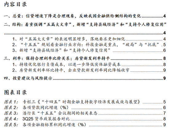 总量:信贷增速下降反映金融供给侧结构变化 - 信贷增速下降是合理现象,反映金融供给侧结构变化,社会融资规模和货币供应量是更全面合理的观察指标[1][8] - 信贷增速下降的四个原因包括:地方专项债置换平台贷款、中小银行改革化险与中长期结构演变叠加下拉贷款增长[9];地方政府发行4万亿元特殊再融资债券,其中60%-70%用于偿还银行贷款[10];2024年金融机构贷款核销约1.3万亿元,2025年前9个月已核销超1万亿元[11];轻资产行业对信贷依赖度较低,难以弥补房地产贷款下降的缺口[12] - 未来金融总量增速下降是自然现象,与经济增长转向高质量发展一致,贷款增速略低于社会融资规模增速是合理的[12] 结构:货币政策强调“五篇大文章”并新增支持领域 - 本次货币政策报告对“五篇大文章”表述明显增多,落地要求更细化,在科技金融、绿色金融、养老金融等领域均有新增具体表述[13] - “十五五”规划中科技金融是重点,政策底层逻辑是“破局”与“托底”:破局即发展新质生产力,托底为防范房地产和地方债务等系统性风险[16] - 结构性货币政策新增两大方向:完善脱贫攻坚后常态化金融支持机制以支持县域经济发展;研究实施支持个人修复信用的政策措施,计划明年初执行[18] - 数字金融发展成效显著,截至2025年9月末数字经济核心产业贷款余额达82万亿元,同比增长13.0%[15] 利率:优化负债成本与贷款利率变化 - 专栏四强调保持合理利率比价关系,由于重定价周期差异和银行竞争等因素,贷款利率下降快于存款利率,压缩银行净息差[21] - 央行通过整治违规手工补息、规范同业存款定价等措施增强银行资产和负债端利率调整联动性,支持银行稳定净息差[21] - 2025年9月一般贷款、个人住房贷款、企业贷款新发利率分别为3.67%、3.06%、3.14%,同比分别下降48bp、25bp、37bp[22] - 个人住房贷款利率环比6月持平,同比降幅收窄14bp;企业贷款利率环比下降6bp,同比降幅收窄6bp[22] 投资建议:银行股投资逻辑与主线 - 银行股从“顺周期”转向“弱周期”,看好板块稳健性和持续性,建议关注成长性高且估值低的城农商行[24] - 第一条投资主线是拥有区域优势的城农商行,重点区域包括江苏、上海、成渝、山东和福建等[24] - 第二条投资主线是高股息稳健逻辑,重点推荐大型银行如六大行,以及股份行中的招商、兴业和中信等[24]