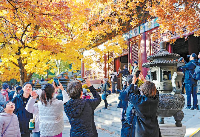 在元宝山区域设置的助农市集汇集了门头沟区多个乡镇的特色农产品,为当地农户搭建起直接面向消费 者的展销平台。 为提升游客体验,景区在多个点位设置了最佳观赏指引,包括帝王树广场全景拍摄点、流杯亭红墙金叶 取景点等。同时,增派服务人员,加强客流疏导,确保游览秩序。 本报讯(记者 张骜)深秋时节,潭柘寺景区内享有"帝王树"美誉的千年古银杏迎来最佳观赏期。景区依 托这一独特生态资源,创新推出"文化+体验+助农"三位一体的文旅融合模式,为游客带来多元化体验 的同时,有效带动了当地产业发展。 今年银杏观赏季期间,景区推出系列创新活动。其中,"风铃祈愿"活动采用环保材质风铃,在活动结束 后,由景区统一寄回游客书写的心愿风铃,让活动道具成为自家心仪小摆件。在帝王树广场,专业民乐 团队以快闪形式演绎《紫竹调》等经典曲目,为游客打造沉浸式文化体验。 昨天,众多游人赴香山赏秋,彩叶与古建相映成趣,移步之间,光影变幻不断,园内处处成画,美不胜 收。 ...