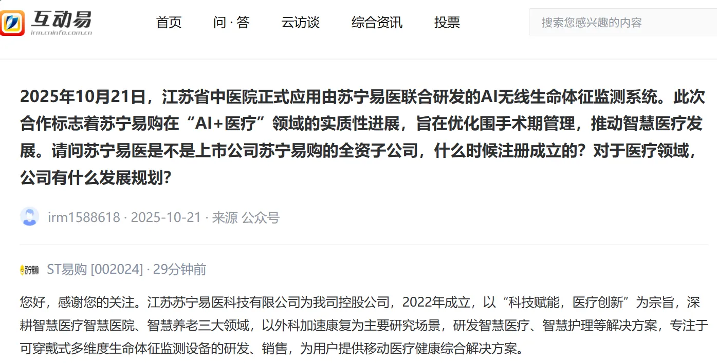ST易购:苏宁易医2022年成立,深耕智慧医疗智慧医院、智慧养老领域