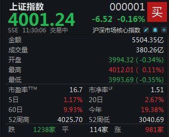 11月7日,A股窄幅整理,截至上午收盘,上证指数跌0.16%报4001.24点,深证成指跌0.16%,创业板指跌0.37%,北证50涨0.93%,科创50跌0.75%,中证 A500跌0.11%,A股半日成交1.27万亿元。 | 上证指数 | | 000001 | | | --- | --- | --- | --- | | | | -6.52 -0.16% | ポ | | 88 11:30:06 交易日 | | 沪深市场核心指数 / @ + | | | 全国 | | | 5504.35亿 | | | | | 380.26亿 | | | | 3994.32 (-0.34%) | | | 板高 | | 4012.01 ( 0.11%) | | | 最低 | | 3993.69 (-0.35%) | | | 三國國北 | 16.7 | 市海波比 | 1.51 | | 5日 | 1.17% | 20日 | 2.67% | | 60日 | 9.93% | 出 | 1938% | | 52周筒 | 4025.70 | 52周低 | 3040.69 | | 1738 % | ্রত | 114家 流 | 981家 | 资金 ...