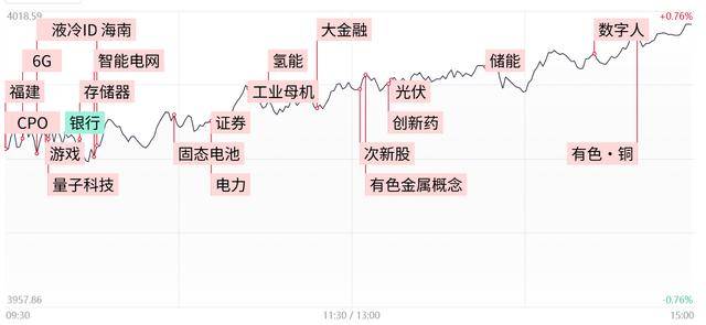 核心观点 - 沪指收盘站上4000点大关,市场整体呈现震荡上行格局,预计后市将延续9月以来的震荡上行趋势且斜率相对平缓 [1][4][6] - 增量资金持续流入态势未改,沪深两市成交额达2.26万亿元,较上一交易日放量1082亿元,为市场稳健上行提供支撑 [6] - 宏观环境有利于新兴成长板块,政策层面强调创新驱动,建议重点关注红利、TMT、新能源、有色金属等板块 [6] 市场表现 - 主要指数集体上涨:上证指数收于4016.33点,上涨0.70%(28.11点);深证成指收于13691.38点,上涨1.95%(261.28点);创业板指收于3324.27点,上涨2.93%(94.70点),创年内新高;北证50指数表现突出,大幅上涨8.41%(122.15点) [2][4][6] - 行业板块表现分化:电力设备(+4.79%)、有色金属(+4.28%)、非银金融(+2.08%)领涨;银行(-1.98%)、综合(-0.56%)、食品饮料(-0.56%)表现靠后 [3][4] - 概念板块活跃:海南自贸区(+4.35%)、BC电池(+3.89%)、金属锌(+3.60%)、金属铅(+3.56%)、石墨电极(+3.55%)涨幅居前 [3][4] 后市展望与技术分析 - 技术面上,沪指突破4000点关键阻力位,深成指逼近压力位,整体上行格局进一步确立 [6] - 市场上涨股票数量超过2600只,逾60只股票涨停,盘面上海南板块、大金融(证券领涨)、有色金属及量子科技概念表现活跃 [4] - 宏观支撑因素包括:宏观经济处于逐步修复通道、产业技术迭代加速、政策强调创新驱动、并购重组及IPO政策向科技创新类企业倾斜 [6] 政策动态 - 《中共中央关于制定国民经济和社会发展第十五个五年规划的建议》明确提出“加快建设金融强国”,要求完善中央银行制度,构建稳健的货币政策体系,并大力发展科技金融、绿色金融、普惠金融、养老金融、数字金融 [5] - 央行行长表示将防范化解重点领域金融风险,巩固资本市场向好势头,健全稳市机制,相关表述向市场传递了明确政策信号,有助于增强信心 [5]