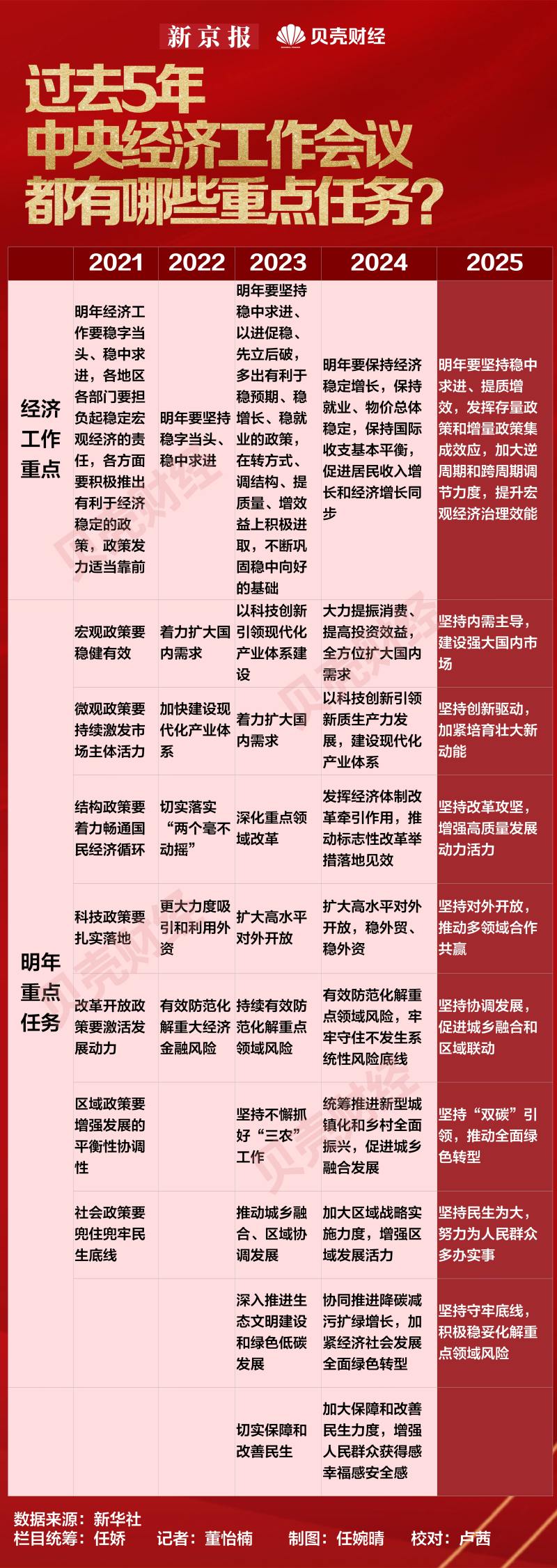 中央经济工作会议12月10日至11日在北京举行。习近平总书记出席会议并发表重要讲话,总结2025年经济工作,分析当前 经济形势,部署2026年经济工作,为实现"十五五"良好开局定向领航。 不断深化新形势下做好经济工作的规律性认识 2025年是"十四五"规划收官之年,在中国式现代化进程中具有重要意义。 会议总结今年经济运行情况,指出"经济社会发展主要目标将顺利完成""'十四五'即将圆满收官,第二个百年奋斗目标新征 程实现良好开局"。 会议认为,通过实践,我们对做好新形势下经济工作又有了新的认识和体会:必须充分挖掘经济潜能,必须坚持政策支持 和改革创新并举,必须做到既"放得活"又"管得好",必须坚持投资于物和投资于人紧密结合,必须以苦练内功来应对外部挑 战。 新时代以来的中央经济工作会议,一贯重视理论总结,用以指导经济发展实践。随着形势变化,中央经济工作会议持续深 化对经济工作的规律性认识,2021年提出"四个必须",2022年提出"六个坚持",2023年提出"五个必须",2024年提出"根本保 证""五个必须统筹"。 原标题:新华全媒头条·聚焦中央经济工作会议|推动经济实现质的有效提升和量的合理增长——从中央经 ...