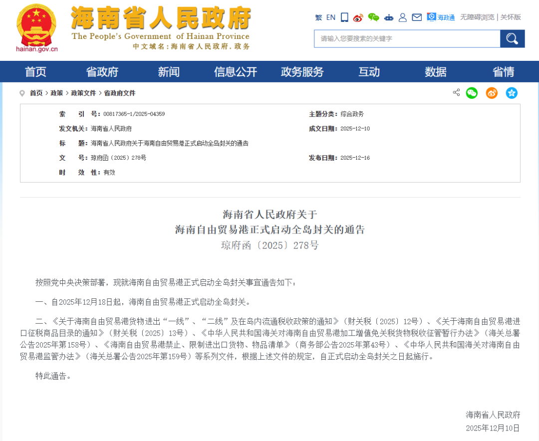 海南省政府网16日发布《海南省人民政府关于海南自由贸易港正式启动全岛封关的 通告》: 2025年12月10日 有些网友疑惑, 明明是"进一步扩大开放" ,为何叫"封关"? 封关的目的是什么? 封关后去海南,需要办理通行证吗?企业和居民如何享受便利? 什么是封关?封关"封"的又是什么? 其实,封关不是封岛,而是指将海南岛全岛建成一个海关监管特殊区域,实施以 "'一线'放开、'二 线'管住、岛内自由"为基本特征的自由化便利化政策制度。 据"海南自由贸易港"微信公众号介绍,"一线"指国境线,即从境外到自贸区(港)内;"二线"指自 贸区(港)的空间分割线,即自贸区(港)与境内其他区域之间的分割线。 按照党中央决策部署,现就海南自由贸易港正式启动全岛封关事宜通告如下: 一、自2025年12月18日起,海南自由贸易港正式启动全岛封关。 二、《关于海南自由贸易港货物进出"一线"、"二线"及在岛内流通税收政策的通知》(财关税 〔2025〕12号)、《关于海南自由贸易港进口征税商品目录的通知》(财关税〔2025〕13号)、 《中华人民共和国海关对海南自由贸易港加工增值免关税货物税收征管暂行办法》(海关总署公告 2025年第15 ...