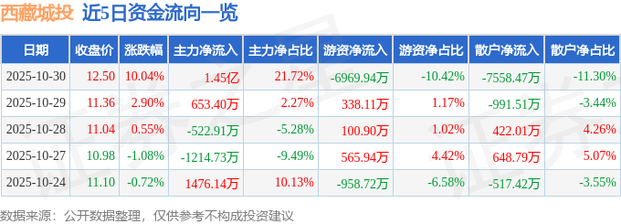 证券之星消息,西藏城投10月30日涨停收盘,收盘价12.5元。该股于13点52分涨停,未打开涨停,截止 收盘封单资金为9163.75万元,占其流通市值0.77%。 今日西藏城投涨停的可能因素有:1、公司战略转型取得实质性突破,成功推进14.01亿元CMBS融资计 划,控股股东提供增信及优质物业抵押,融资成本显著低于传统贷款,资产负债率由60.71%降至 58.88%,财务结构优化为业务拓展提供支撑;2、新能源转型加速,盐湖提锂业务进展顺利,1万吨氢 氧化锂产线建设中,3300吨产线已贯通,叠加锂电材料价格上涨及行业景气度提升,市场预期增强; 3、酒店业务表现亮眼,静安假日酒店收入同比大增246.86%,成为多元化盈利增长点;4、所属盐湖提 锂板块近期受市场关注,板块联动效应显现。 该股为锂电池,盐湖提锂,新能源汽车概念热股,当日锂电池概念上涨1.06%,盐湖提锂概念上涨 0.71%。 | | | | | 日期 收盘价 涨跌幅 主力净流入 主力净占比 游资净点比 散户净流入 散户净占比 | | | | | | --- | --- | --- | --- | --- | --- | --- | --- | --- ...
