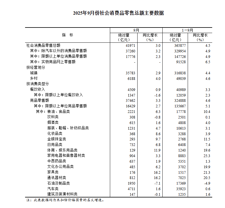 2025年9月社零数据点评:9月社零整体同增3.0%,家具品类增速较快