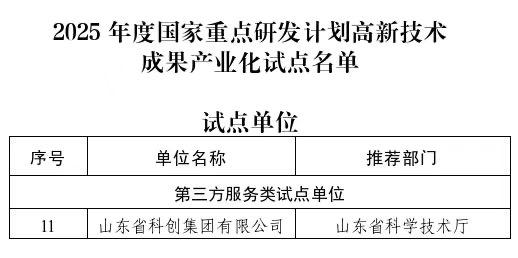 | | 第三方服务类试点单位 | | | --- | --- | --- | | 序号 11 | 单位名称 山东省科创集团有限公司 | 推荐部门 山东省科学技术厅 | 近日,工业和信息化部办公厅正式公布2025年度国家重点研发计划高新技术成果产业化试点名单,山东 科创实现试点成果、试点单位双项入选。 山东科创作为山东省唯一入选的服务类领域机构(全国共19家),是工信部对集团科创服务、科技成果转 化工作的高度肯定,标志着山东科创近年来推动科技创新与产业创新深度融合的实践做法获得认可,打 通了与工信部科技成果转化工作的衔接,更加夯实了发展信心。 下一步,山东科创将严格按照试点要求,做实概念验证、小试、中试平台,做优服务全省中小企业研发 平台,畅通科技成果转化服务链条,为高新技术成果产业化转化提供全方位保障,支撑全省现代化产业 体系建设和经济发展。 此次试点工作是工信部深入贯彻落实科技创新与产业创新融合发展决策部署的重要举措,首批聚焦先进 制造、新材料等7个领域确定67个试点成果,按照区域类、产业化实施类、第三方服务类、金融服务类 等四类确定108家试点单位,旨在加快推动国家重点研发计划成果向规模化生产、市场化运营 ...