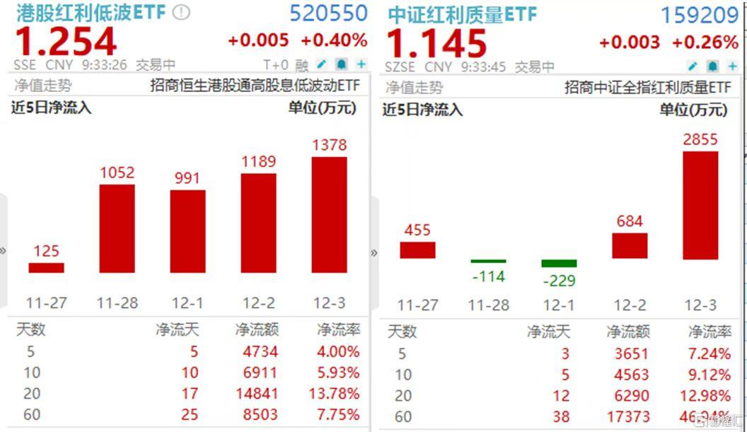 两只基金均设计了低费率和月度分红评估机制,旨在优化投资者的长期持有体验。市场分析指出,投资者通过结合配置这两只分别侧重港股与A股、 风格上一守一攻的ETF,可以构建一个跨市场的红利策略组合,从而在分散市场风险的同时,兼顾投资的防御性与进攻性。 尽管同属红利策略范畴,这两只基金在投资逻辑与风格定位上各有侧重,形成有效互补。港股红利低波ETF(520550)代表了"深度价值派"的投资思路, 其核心是筛选"高股息率+低波动率"的标的,侧重于布局金融、公用事业、能源等盈利稳定、具备防御属性的传统高股息板块,力求在提供分红回报的 同时控制组合的整体波动。 与之形成对比的是中证红利质量ETF(159209),它属于"价值成长派"。该产品在追求高股息率的基础上,叠加了"高盈利质量"的筛选标准,重点在消 费、医药等具备长期成长性的优质赛道中,挑选基本面扎实、盈利能力强的上市公司。其目标是以相对温和的股息率为代价,换取企业长期增长带来 的更大股价弹性,被视为在牛市中更具进攻性的红利投资选择。 12月4日,A股与港股市场红利资产同步走强,两大代表不同风格的ETF携手录得红盘。其中,港股红利低波ETF(520550)上涨0.48% ...
