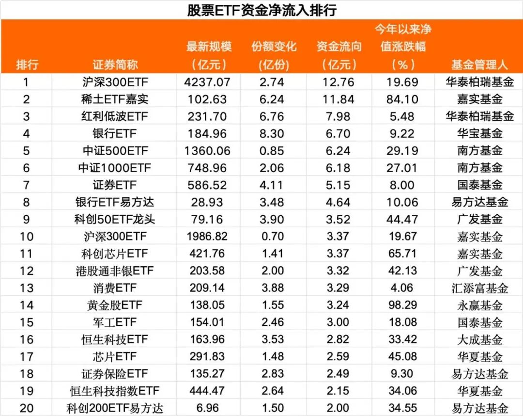 市场整体资金流向 - 10月15日(周三)A股市场主要指数普遍上涨,沪指重返3900点,创业板指数涨幅超过2.3% [1] - 当日股票ETF市场资金净流入88亿元,若包含商品型黄金ETF,总资金净流入超过120亿元 [1] - 10月以来的五个交易日,股票ETF连续实现资金净流入,累计净流入金额超过800亿元 [1][3] - 截至10月15日,全市场1228只股票ETF(含跨境ETF)总规模为4.59万亿元 [3] 单日资金净流入领先的ETF类别 - 10月15日资金净流入1亿元以上的股票ETF有49只 [3] - 宽基ETF中,华泰柏瑞沪深300ETF单日净流入12.76亿元,规模达4237.07亿元 [6] - 行业主题ETF中,嘉实稀土ETF单日净流入11.84亿元,规模为102.63亿元 [6] - 华泰柏瑞红利低波ETF单日净流入7.98亿元,规模为231.70亿元 [6] - 易方达基金数据显示,当日沪深300指数相关ETF净流入18.9亿元,红利主题净流入14.8亿元,银行主题净流入13.6亿元,稀土主题净流入12.7亿元 [3] 主要基金公司旗下ETF资金流向 - 易方达基金旗下,银行ETF易方达净流入4.7亿元,规模29亿元创历史新高;沪深300ETF易方达净流入1.9亿元,规模达3038亿元;恒生科技ETF易方达净流入1.2亿元,规模225亿元创历史新高 [4] - 华夏基金旗下,芯片ETF单日净流入2.59亿元,规模291.83亿元;恒生科技指数ETF净流入2.15亿元,规模444.47亿元 [5] - 商品型黄金ETF因国际金价创新高持续获青睐,仅周三当日资金净流入便达到35.5亿元,近五个交易日流入相关ETF超114亿元 [3] 近期资金流入的主要板块 - 10月以来,恒生科技、稀土有色、科创芯片、银行、证券等ETF成为资金流入主力 [1] - 恒生科技相关ETF近五个交易日资金净流入接近95亿元,其中近期资金流入超94亿元 [1][4] - 资金净流入前20的股票ETF中,行业主题方面芯片和证券各有2只,稀土、红利、银行等各有1只 [4] 资金净流出情况 - 10月15日,部分股票ETF整体净流出资金较多,有22只净流出资金超过1亿元 [7] - 资金净流出前20的股票ETF中,3只创业板ETF净流出近14亿元,3只科创相关ETF净流出近12亿元 [7] - 中概互联网、新能源以及中证A500等相关ETF资金净流出也较多 [7] - 10月以来,中证A500等相关ETF成为资金流出的主要阵营 [7] 市场观点与展望 - 市场观点认为10月份进入政策与业绩验证的关键窗口,结构性机会与波动并存 [7] - 三季报密集披露可能强化盈利驱动逻辑,科技制造和资源品等领域有望获资金聚焦 [7] - 另一观点指出,市场可持续的上涨需基本面的切实改善提供支撑,行情纵深取决于经济基本面的复苏强度 [8]