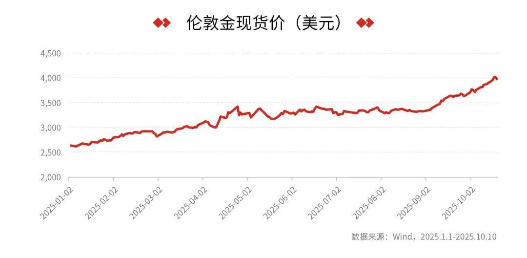 来源:市场投研资讯 (来源:银华市场) 2025年10月8日,伦敦现货黄金价格触及4040.05美元/盎司的历史峰值,这一突破距离3月首次站上3000美元仅隔7个月,年内涨幅已超50%(2025.1.1- 2025.10.10),创下1980年以来(1980.1.1-2025.10.10)最快年度涨速。(数据来源:Wind)宏观政策的"东风"、地缘局势的"小插曲"等多种因素一合起 来,把黄金这避险选手抬上了从没到过的"山顶"! 01 金价上涨的底层逻辑:为何达成从3000到4000的飞跃? 黄金价格从3000美元到4000美元的飞跃仅用半年多时间,3月中旬首次突破3000美元关口后,4月便快速站上3500美元,随后在3300-3600美元区间震荡调 整;9月美联储降息开启宽松周期成为关键催化剂,金价进入"百米冲刺",23日突破3800美元,10月国庆假期期间持续冲高,一周内便站上4000美元历史 高位。(数据来源:Wind) 今年金价上涨的底层逻辑,离不开美元信用危机、美联储降息、地缘政治冲突升级等等原因: 近期,美国政府停摆与关税扰动再起,黄金避险需求提升。国庆期间,美国两党因医改条款分歧未通过临时拨款,政 ...