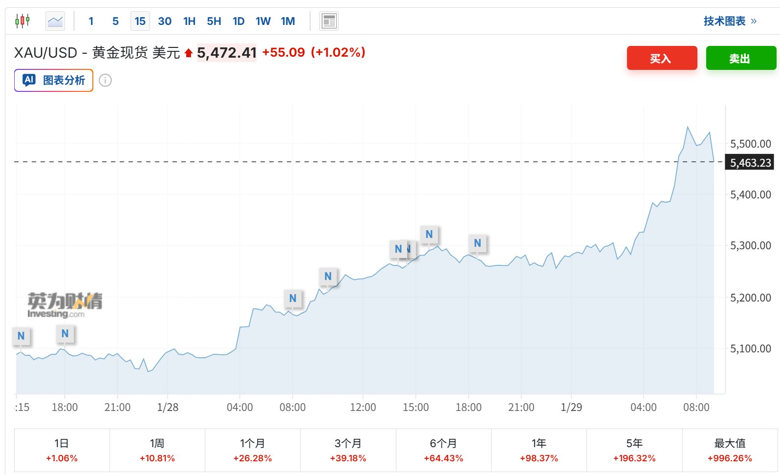 黄金白银不断刷新历史新高! 石油方面,随着伊朗局势升温,国际油价集体飘红。WTI原油涨近1.8%,报63.5美元/桶,ICE布油涨超1.6%,报67.68美元/桶,同步升至2025年9月以来高 点。 警惕! 上期所、上金所双双发布通知 29日,现货黄金冲上5500美元/盎司! | W | | 伦敦金现 | | | | --- | --- | --- | --- | --- | | | | SPTAUUSDOZ.IDC | | | | 5487.560 | 昨结 | 5417.747 开营 | 5416.334 | | | +69.813 +1.29% | | 总量(kq) 0.00 现手 | O | | | 最高价 5598.750 | 持 仓 | 0 | 外 盘 0 | | | 最低价 5416.260 | 增 仓 | 0 | 内 盘 0 | | | 42 | 五日 EK 周K | | 日末 | | | 叠加 | | 均价: -- | 盘口 | | | 5598.750 | | 3.34% 卖1 | 5489.212 - 0 | | | | | ਸੀ। | 5488.888 0 08:06 5488.000 ...