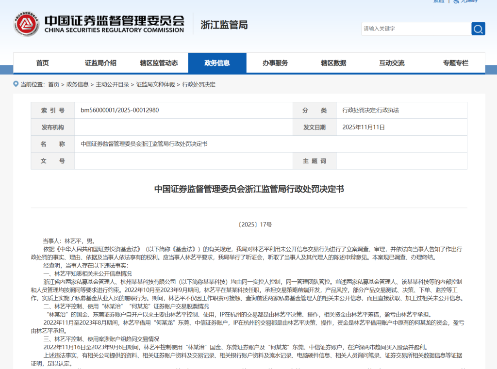 一位私募IT人员抄公司作业做"老鼠仓"被没一罚一,合计罚没1.77亿元,5年市场禁入。 近日,证监会浙江监管局公布了对林艺平利用未公开信息交易行为的行政处罚决定。林艺平因违反《中华人民共和国证券投资基金法》《私募投 资基金监督管理暂行办法》及《私募投资基金监督管理条例》等相关规定,被责令改正、警告,并没收违法所得8857.69万元,处以同等金额罚 款,合计罚没金额达1.77亿元。同时,林艺平被采取5年证券市场禁入措施。 公告显示,林艺平在2022年10月至2023年9月期间,任职于杭州某某科技有限公司(以下简称"某某科技"),承担交易策略前端开发、产品风控及 部分产品交易测试、决策、下单、监控等工作。 调查显示,某某科技与浙江省内两家私募基金管理人由同一实际控制人控制,且内部控制和人员管理采用同一标准。林艺平在履职过程中,不仅 能够接触和查询相关未公开信息,还直接获取并加工了这些信息。 在2022年11月16日至2023年9月6日期间,林艺平控制使用"林某治"国金、东莞证券账户及"何某龙"东莞、中信证券账户,在沪深两市趋同买入股 票并盈利。 详细交易记录显示,"林某治"名下的国金证券、东莞证券账户自开户以来, ...
