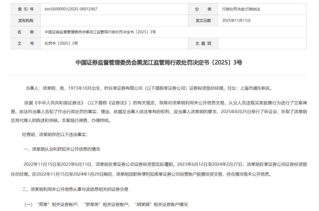 上述账户累计趋同买入金额55134.90万元,占其总体买入金额的77.54%,累计无违法所得。 另外,汤某明还利用未公开信息明示、暗示他人从事相关交易。2022年11月15日至2024年1月29日期 间,汤某明利用因职务便利获取的未公开信息,明示、暗示邢某从事相关交易活动。邢某控制使用"邢 某芳"中信证券账户在沪深两市累计趋同买入中国卫星、保利发展等75只股票、趋同买入金额9771.34万 元,分别占其总体买入只数、买入金额的81.52%、85.02%,无违法所得。 近日,黑龙江证监局发布了一则行政处罚。时任某券商证券投资部总经理的汤某明,利用职务之便,知 悉券商自营账户股票交易情况,进行老鼠仓交易,买入5.5亿元最后亏损。此外,他还明示、暗示其他2 人从事相关交易,这2人累计买入2.4亿元,同样还是亏损。 依据证券法的有关规定,黑龙江证监局对汤某明利用未公开信息交易、从业人员违规买卖股票行为进行 了立案调查,依法向当事人告知了作出行政处罚的事实、理由、依据及当事人依法享有的权利,应当事 人汤某明的要求,2025年8月25日举行了听证会,听取了汤某明及其代理人的陈述和申辩。本案现已调 查、办理终结。 2022 ...