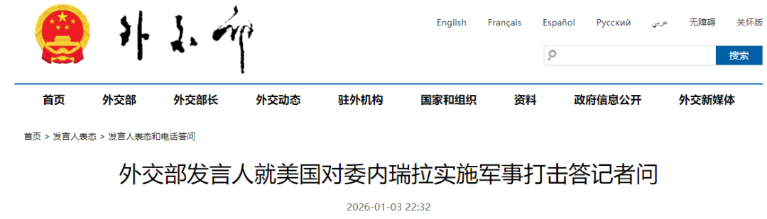 答:中方对美方悍然对一个主权国家使用武力并对一国总统动手深表震惊,予以强烈谴责。美方的这种 霸权行径,严重违反国际法,侵犯委内瑞拉主权,威胁拉美和加勒比地区和平与安全,中方坚决反对。 我们敦促美方遵守国际法及联合国宪章宗旨和原则,停止侵犯别国的主权安全。 来源:长安街知事微信公众号 1月3日,外交部官网发布《外交部发言人就美国对委内瑞拉实施军事打击答记者问》。 问:据报道,美国对委内瑞拉实施军事打击。特朗普在"真实社交"发文称,美国已成功对委内瑞拉及其 领导人马杜罗实施大规模打击行动,马杜罗及其夫人已被控制并移送出境。中方对此有何评论? 转自:北京日报客户端 ...