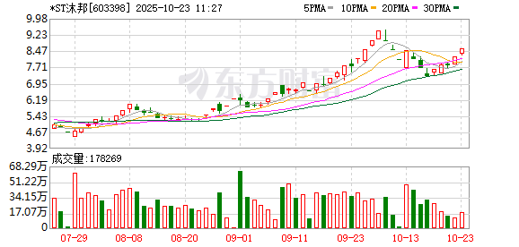 *ST沐邦再度涨停,5个交易日内录得3个涨停,累计涨幅为18.13%,累计换手率为20.34%。截至 10:45,该股今日成交量1533.67万股,成交金额1.30亿元,换手率3.54%。最新A股总市值达37.29亿元。 公司10月22日在交易所互动平台中披露,截至最新(10月20日)股东户数为23618户。 | 日期 | 当日涨跌幅(%) | 换手率(%) | 主力资金净流入(万元) | | --- | --- | --- | --- | | 2025.10.22 | 5.00 | 2.75 | 1449.40 | | 2025.10.21 | -0.38 | 3.25 | -848.45 | | 2025.10.20 | 2.49 | 4.45 | -273.84 | | 2025.10.17 | 4.95 | 6.35 | -227.69 | | 2025.10.16 | -4.96 | 7.26 | -1646.10 | | 2025.10.15 | -4.96 | 6.17 | -1131.86 | | 2025.10.14 | -4.95 | 9.90 | -3829.55 | | 2025.10 ...