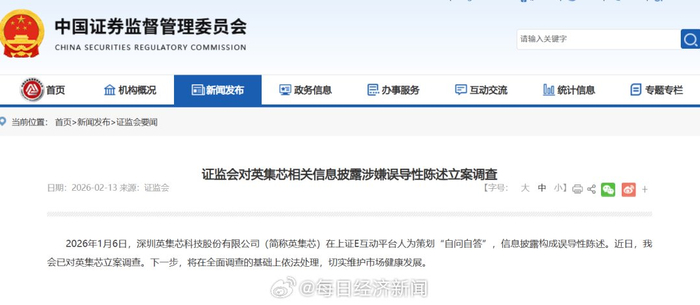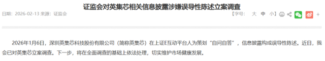 事件概述 - 证监会于2月13日宣布对深圳英集芯科技股份有限公司立案调查 原因为公司涉嫌信息披露违法违规 具体指向其在2026年1月6日于上证E互动平台“自问自答” 构成误导性陈述 [3] - 公司于2月13日晚间公告确认收到证监会立案告知书 [3] 涉事信息披露详情 - 2026年1月6日 有投资者在上证E互动平台提问 询问公司在脑电信号采集等脑机接口核心芯片方面的产品进展与规划 [5] - 公司当日回复称 通过早期投资布局已涉足脑机接口芯片领域 并介绍了其产品IPA1299 该产品是一款8通道、低噪声24位ADC芯片 专用于人体生物电信号高精度测量 适用于脑电信号采集等场景 且已量产出货 性能可媲美海外头部产品 [5] - 1月7日盘前 公司发布补充说明 指出IPA1299适用于各种可穿戴设备 技术路线与国际侵入式脑机接口存在显著差异 该产品在非侵入式脑机接口领域尚处市场培育期 未实现规模化销售 未对公司业绩产生重大影响 未来销售存在不确定性 [6] 监管处理与市场反应 - 1月7日深夜 上交所对英集芯及时任董事会秘书吴任超予以监管警示 [6] - 上交所指出 公司回复内容未能准确反映IPA1299芯片产品的推出主体、销售规模、国际产品路径差异 也未充分提示未来销售不确定性 信息披露不准确、不完整 风险提示不充分 [9] - 1月7日 公司股价收盘上涨4.51% [6] - 截至2月13日收盘 公司股价为24.42元/股 总市值为106亿元 [11] 公司背景与行业监管动态 - 英集芯成立于2014年 2022年于科创板上市 主营业务包括电源管理芯片、快充协议芯片、数据传输处理芯片、无线信号处理芯片、智能音视频芯片等 产品广泛应用于消费电子、汽车电子等多个领域 [11] - 近期监管部门对上市公司“蹭热点”行为关注度提升 2月以来 天合光能、冠盛股份已就上证E互动回复发布说明公告 其中天合光能因回复内容与事实明显背离、信息披露不完整不准确等问题被上交所予以监管警示 [15]