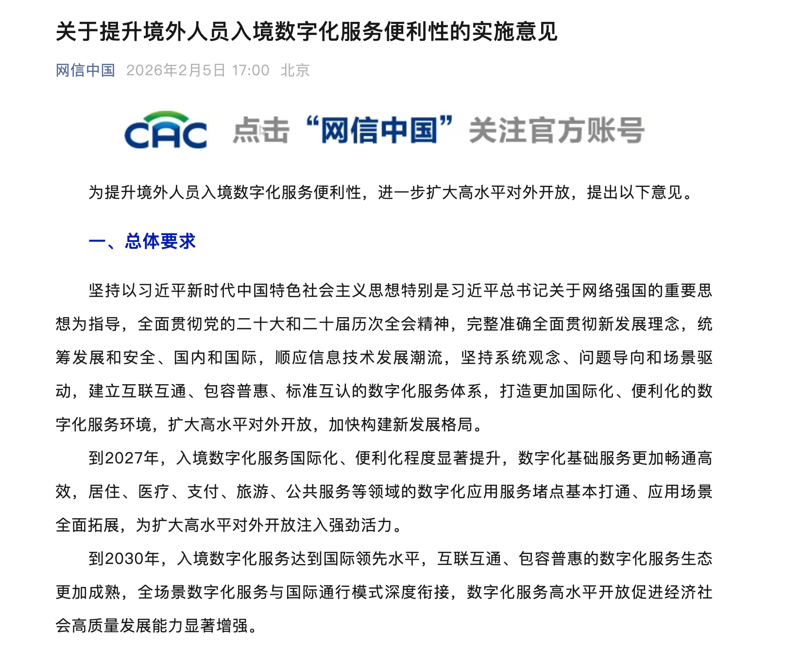 政策目标 - 提出两个阶段性目标:到2027年,入境数字化服务国际化、便利化程度显著提升,居住、医疗、支付、旅游、公共服务等领域的数字化应用服务堵点基本打通、应用场景全面拓展 [3] - 到2030年,入境数字化服务达到国际领先水平,互联互通、包容普惠的数字化服务生态更加成熟,全场景数字化服务与国际通行模式深度衔接 [3] 主要工作举措 - 完善数字化支付服务:提升数字支付便利性,支持更多境外电子钱包在境内使用,持续推进开放信用监管数据试点,支持数字化服务平台扩大免押金等优惠政策适用范围 [4] - 完善消费数字化服务:引导商超、餐饮企业和外卖服务平台提升数字化服务能力,深化人工智能、虚拟现实、大数据等技术在消费领域应用,打造一批“人工智能+消费”典型示范场景 [4] - 完善消费数字化服务:推动离境退税线上办理,研究推动入境文旅消费个人智能设备的配备与应用 [4] - 优化数字化旅游服务:拓展文化和旅游线上服务渠道,鼓励博物馆、景区等加强官方网站和移动应用程序建设,优化境外人员常用证件线上预约服务 [4] - 优化数字化旅游服务:提升在线旅游平台和住宿经营单位涉外服务能力,加强入住自助线上预登记服务,简化信息采集,规范在线旅游平台订单履约管理 [4] - 优化数字化旅游服务:优化网上申报住宿登记流程,便利境外人员在旅馆以外居住办理登记 [4] 网络与数据安全 - 加强网络安全防护能力,加强关键信息基础设施安全保护,完善跨境支付、在线预约等境外人员高频使用场景的安全标准规范 [5] - 深化拓展网络安全国际合作,依法防范和打击危害网络安全的各类违法犯罪活动,优化风险提醒和应急处理体系 [5] - 提升数据安全与个人信息保护水平,加强数据分类分级保护,强化数据收集、存储、使用等全流程管理,防范身份证件、健康档案等敏感信息泄露滥用 [5] - 持续健全完善数据跨境流动安全管理体系,积极参与数据跨境流动国际规则和标准的制定,强化数据出境安全监管技术能力建设和运用 [5] 预期效果与实施 - 预期效果一:激发入境消费新潜力,完善数字化支付、旅游服务有助于释放境外人员入境消费潜力,带动旅游、住宿等服务业繁荣发展,激发数字经济产业活力 [6] - 预期效果二:打造对外开放金名片,帮助全球友人更好融入我国数字化服务体系,提升人员往来便利性,促进国际合作深化 [6] - 预期效果三:提升国际影响软实力,借助网络信息技术应用彰显我国信息化发展成就,提升我国在全球人才流动和国际经贸合作中的竞争力、吸引力和影响力 [6] - 实施步骤:国家网信办将会同相关部门推进《实施意见》落地,鼓励有条件的地区及重点城市先试先行,总结提炼可参考、可复制的典型经验 [6]