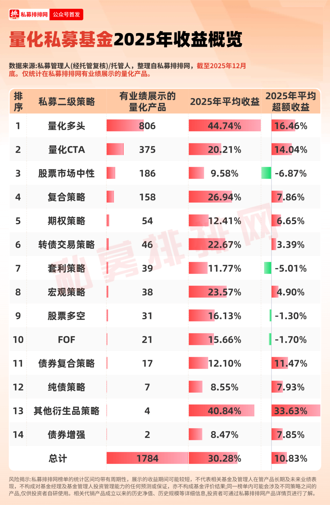 2025年,无疑是量化投资发展史上一个标志性的大年。年初,DeepSeek的横空出世为量化领域注入了颠覆性的AI动能;与此同时,A股市场震荡上行,整 体而言中小盘风格显著占优,中证2000与微盘股指数分别大涨超36%和80%,叠加市场流动性充裕、交投活跃,多重利好共振,令量化多头策略"如鱼得 水",迎来全面爆发! 为能更清晰了解量化私募基金的业绩,经笔者统计,在私募排排网上有业绩展示的量化产品共有1784只,2025年平均收益达30.28%,2025年平均超额 (几何)收益达10.83%;其中量化多头策略产品多达806只,2025年收益和超额(几何)收益分别为44.74%、16.46%,在私募二级策略中居前。 | 排 | 私募二级策略 | 有业绩展示的 | 2025年平均收益 | 2025 E 24 2 | | --- | --- | --- | --- | --- | | 序 | | 量化产品 | | 超额收益 | | 1 | 喜化多杀 | 806 | 44.74% | 16.46% | | 2 | 量化CTA | 375 | 20.21% | 14.04% | | 3 | 股票市场中性 | 186 | 9 ...