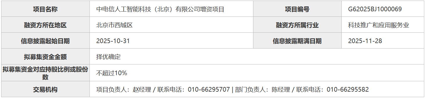 中国电信子公司增资引战事件 - 中国电信旗下两家企业于2025年10月启动增资引战 中电信人工智能科技(北京)有限公司增资项目于2025年10月31日挂牌 天翼视联科技股份有限公司于11天前同步启动引资[1] 中国电信AI公司增资细节 - 拟募集资金对应持股比例不超过10% 增资完成后中国电信仍将持有不低于88%股份[2] - 引入战略投资者旨在借助产业资源和资本力量 加快AI关键核心技术研发 完善市场化机制[2] - 合格意向投资方需在技术研发和市场开拓方面提供配套支持 而不仅是资金投入[2] 子公司战略定位与业务布局 - 中国电信AI公司是智能云体系中MaaS层关键能力载体 对内支持各省公司业务智能化 对外通过标准化产品与行业解决方案输出[3] - 天翼视联公司致力于构建全国统一视频服务基础设施 打造"视联中国"国家级数字化平台 服务于数字政府、智慧城市等重点领域[3] 公司整体科技战略 - 两家子公司增资引战标志中国电信在前沿科技领域布局进入深度市场化阶段 涉及人工智能、云计算、量子科技等长期战略投入[3] - 公司正全面实施"云改数转智惠"战略 推进"人工智能+"行动 以建设网络强国、科技强国为目标[4] - 通过技术势能转化赋能千行百业转型升级 展现央企在建设世界一流科技型企业中的使命担当[4]