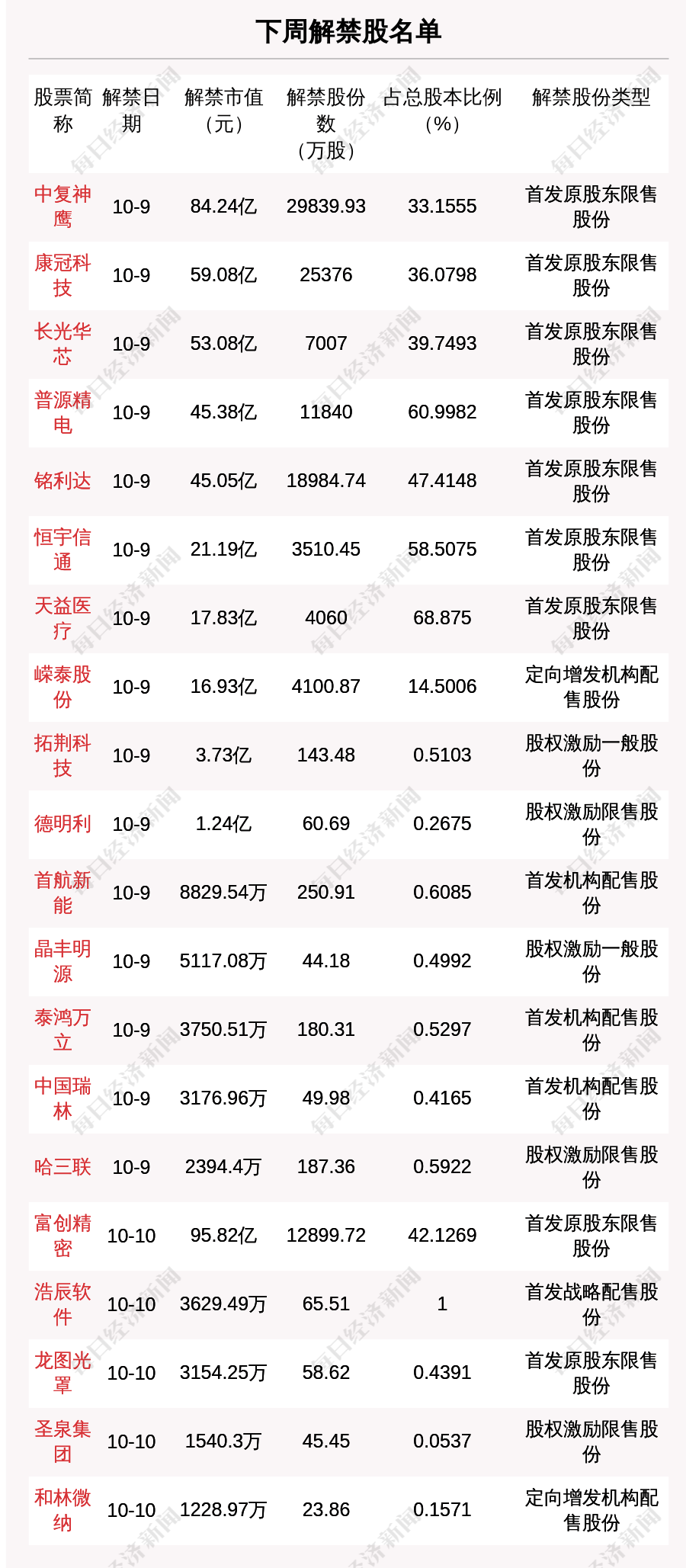 | 能 | | | | | (સે | | --- | --- | --- | --- | --- | --- | | 晶幸明 | 10-0 | 5117.08万 | 44.18 | 0.4992 | 股权激励一般股 | | 源 | | | | | ત્ત્રે | | 泰鸿万 | 10-0 | 3750.517 | 180.31 | 0.5297 | 首发机构配售股 | | 立 | | | | | ત્ત્રે | | 中国瑞 | 10-9 | 3176.96万 | 49.98 | 0.4165 | 首发机构配售股 | | 林 | | | | | 1分 | | 哈三联 | 10-9 | 2394.4万 | 187.36 | 0.5922 | 股权激励限售股 | | | | | | | ત્ત્રે | | 富创精 | 10-10 | 95.82亿 | 12899.72 | 42.1269 | 首发原股东限售 | | 配 | | | | | 股份 | | 浩辰软 | 10-10 | 3629.497 | 65.51 | T | 首发战略配售股 | | 件 | | | | | 份的 | | 龙图光 | 10-1 ...